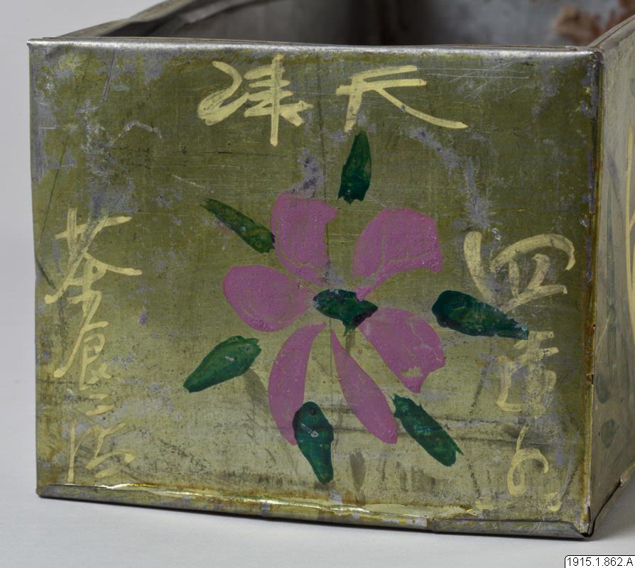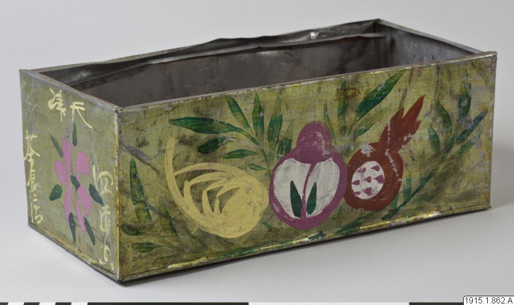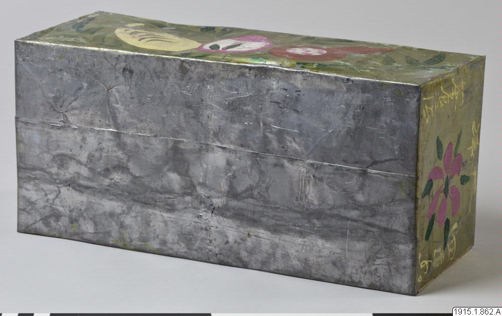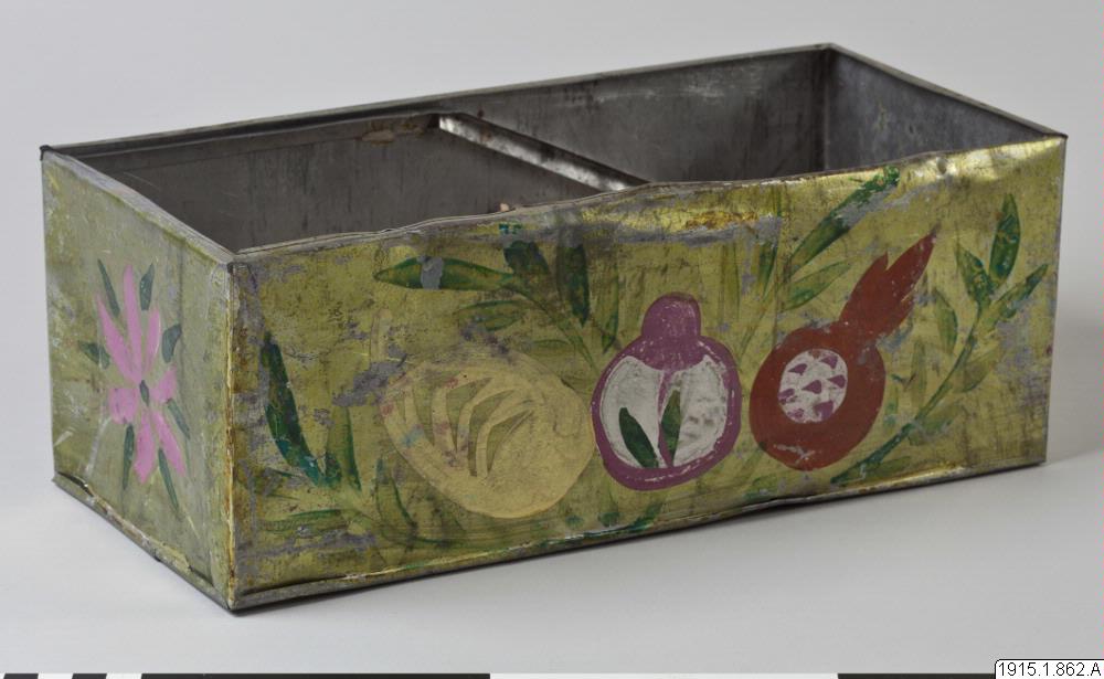 • Ask av plåt, bemålad med klara färger. Blommotiv på gyllene bakgrund.