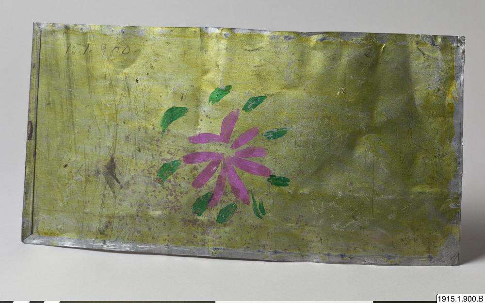 • Lock till ask, bemålad med klara färger. Rosa blomma på grön botten.