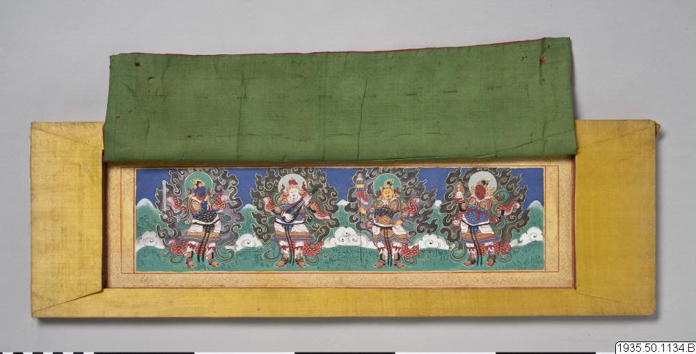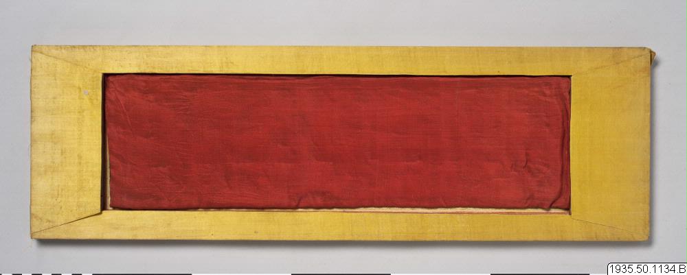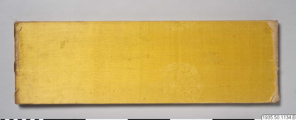 Undre pärm till bok. På insidan under ett draperi finns fyra stycken figurer avbildade. Pärmen är klädd med gult sidentyg på vilken det finns ett tryckt mönster, en drake?