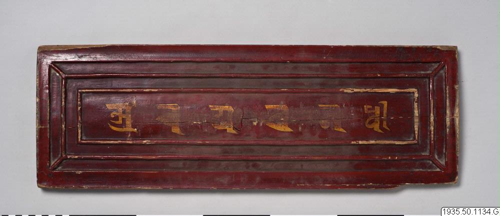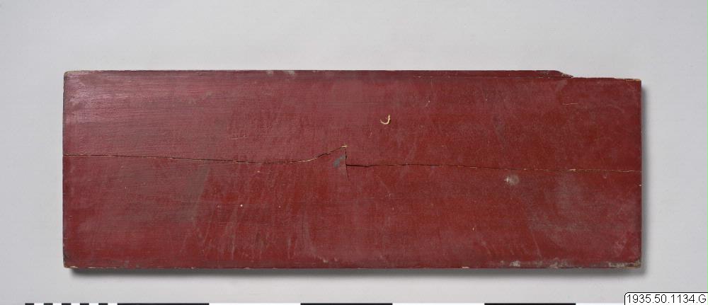 • Undre pärm som skyddar boken. Rödmålad med guldmålad text.