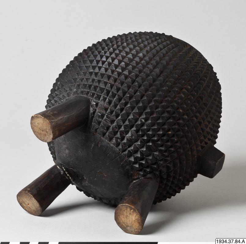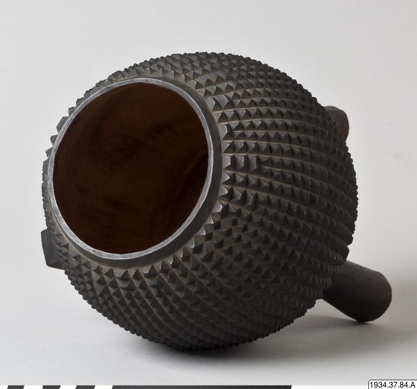 • Kärl av trä med svart, taggig utsida och tre fötter.