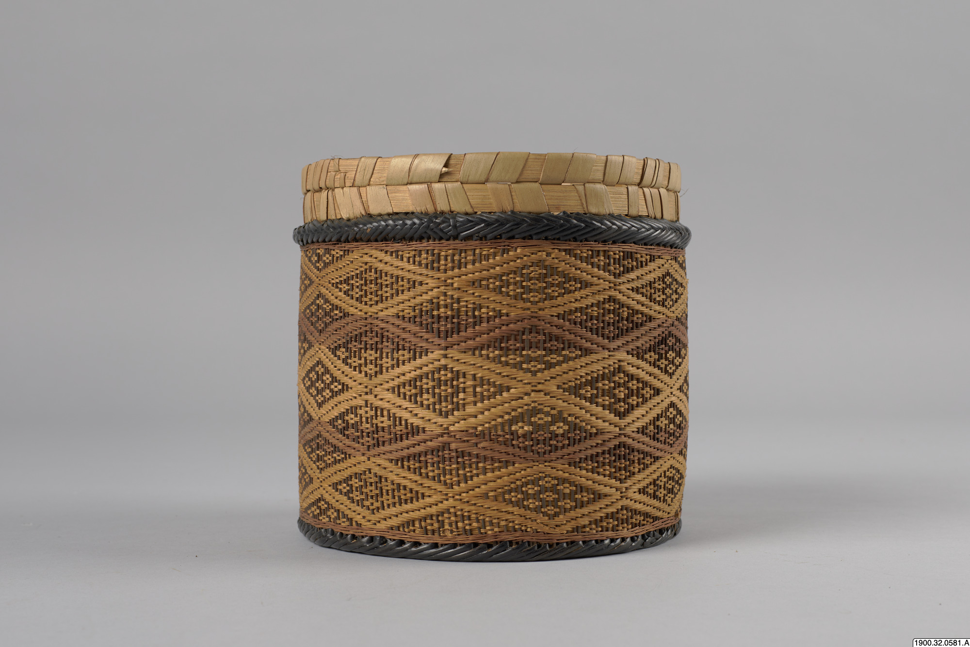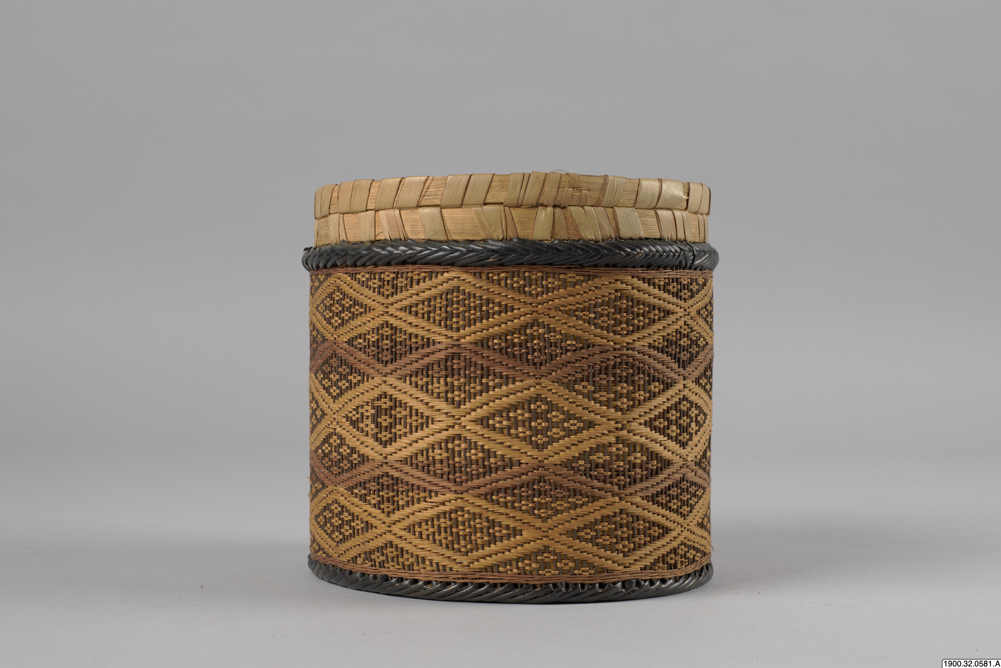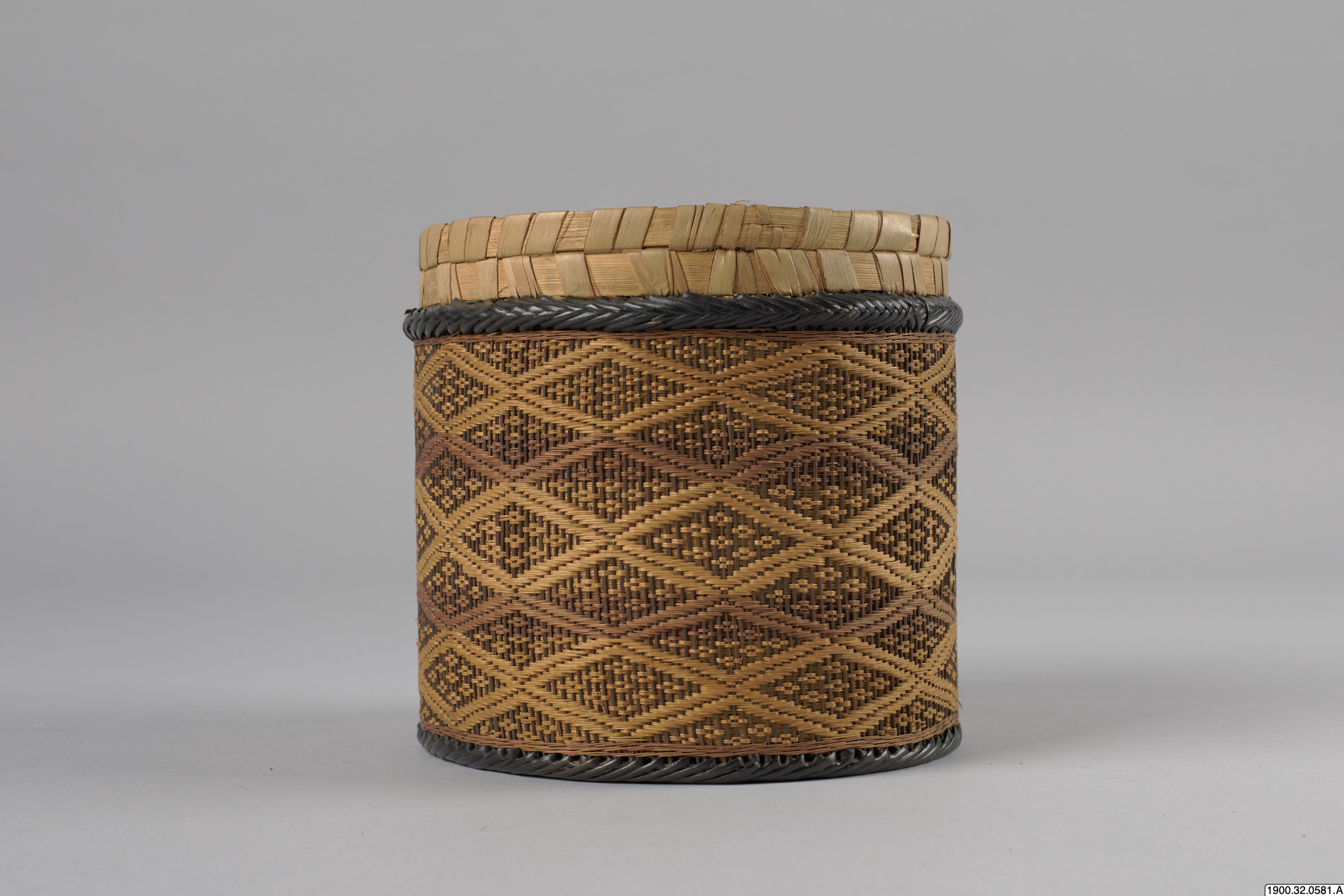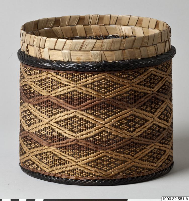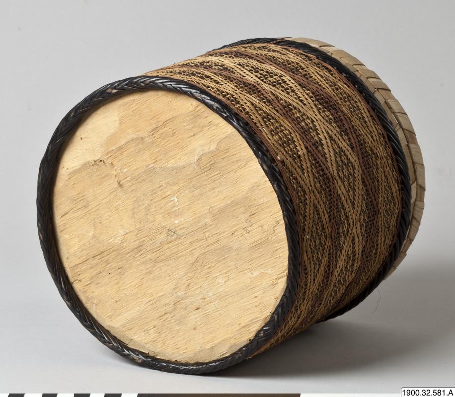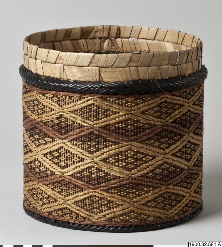 • Cylindrisk korg med lock tillverkat i växtmaterial. Utsidan dekorerad med ett rombiskt mönster. Korgens botten består av en träplatta.