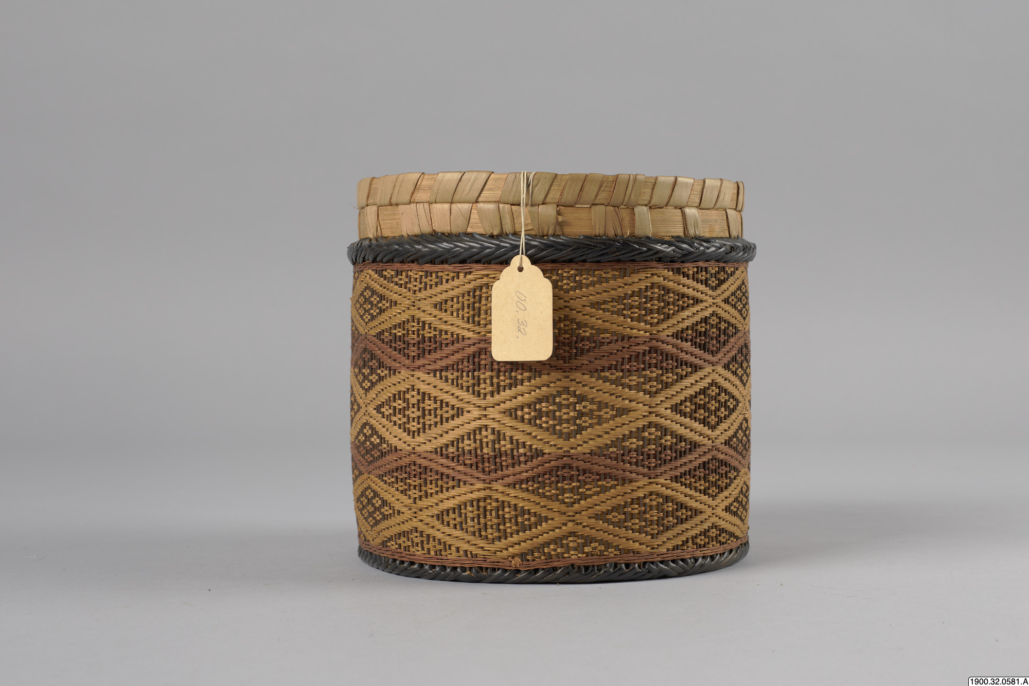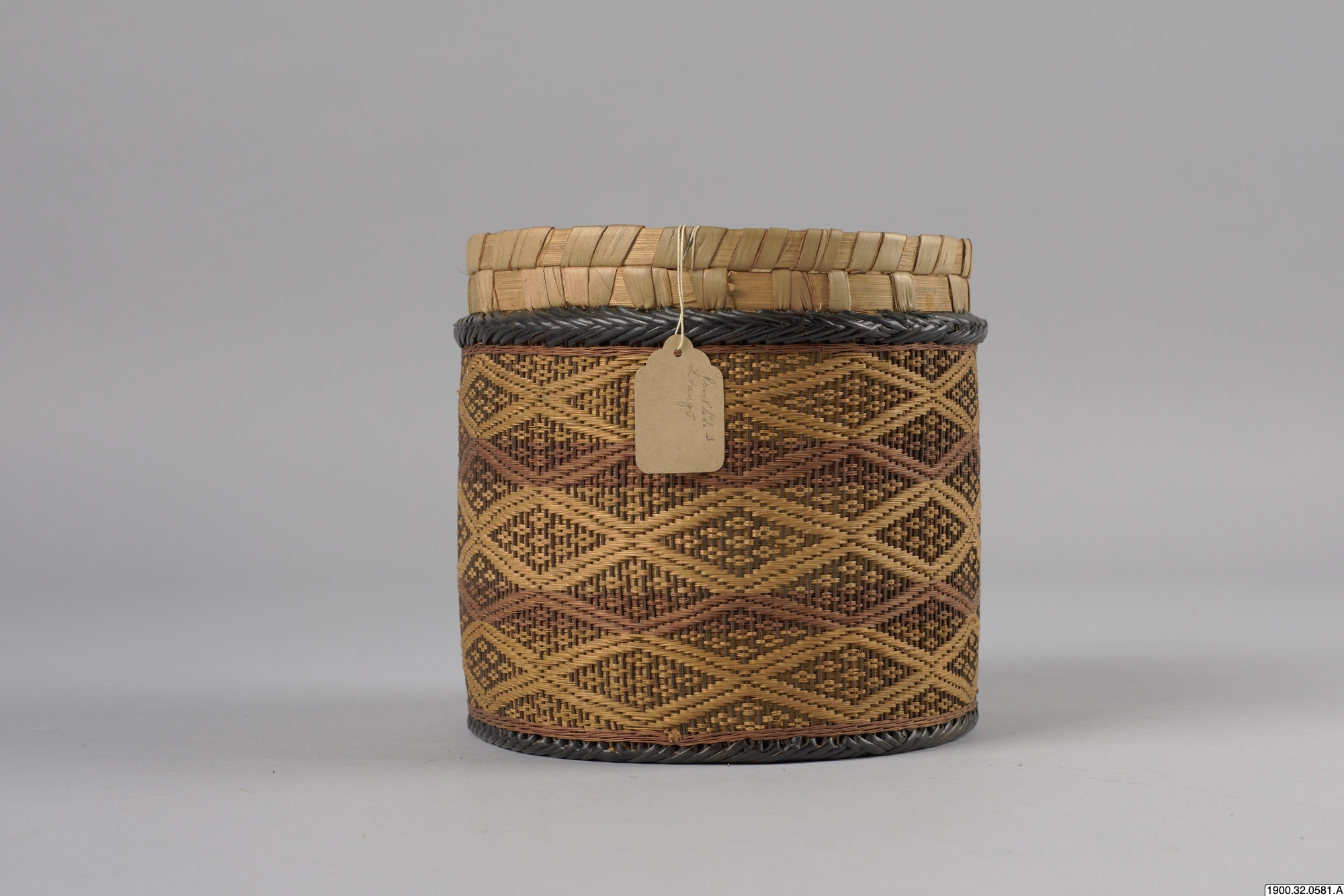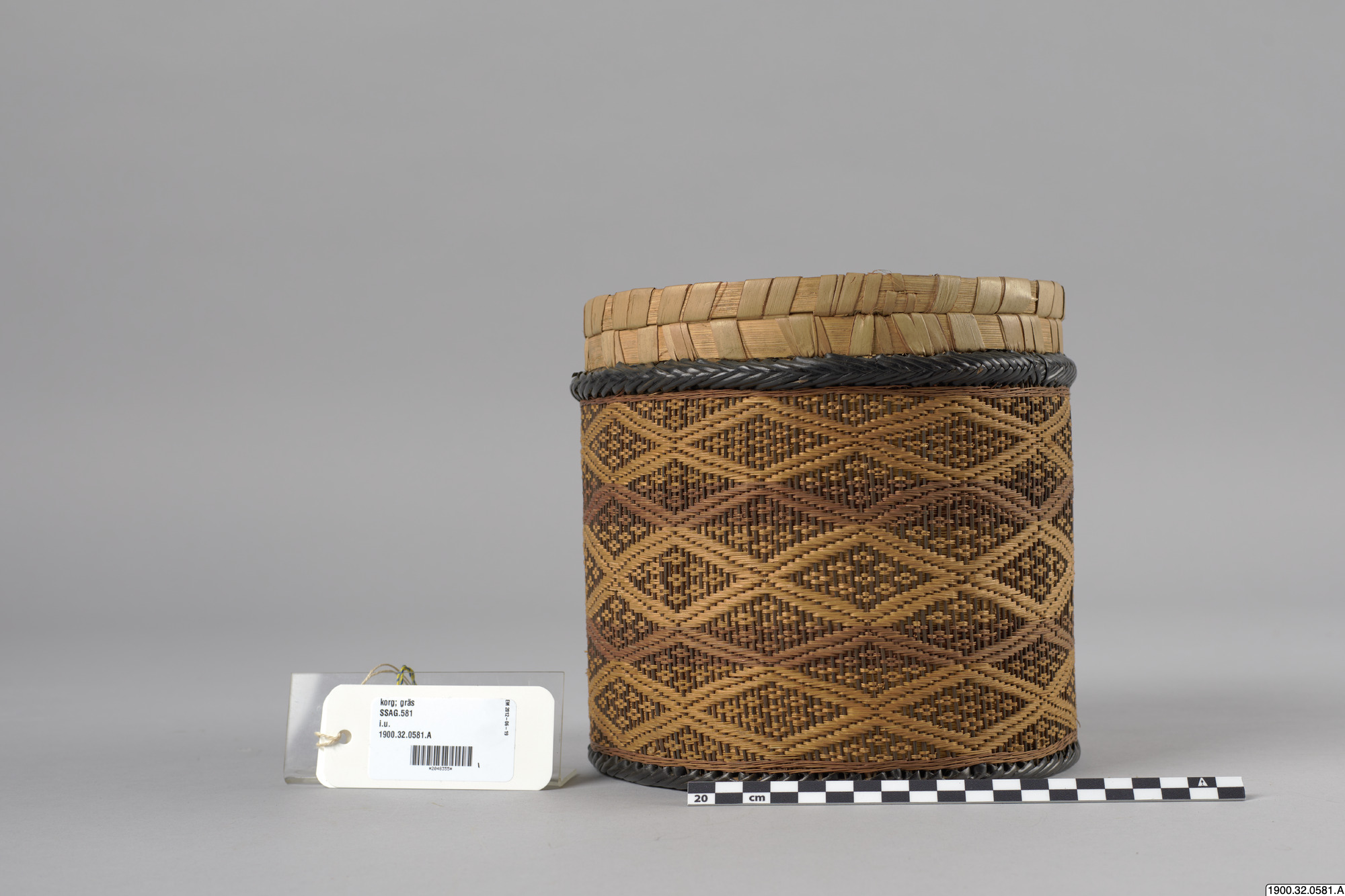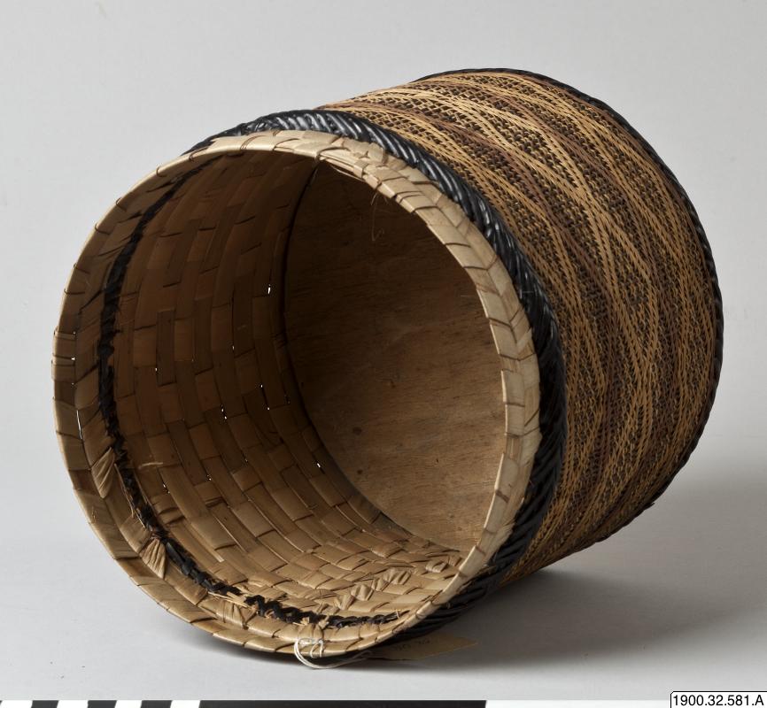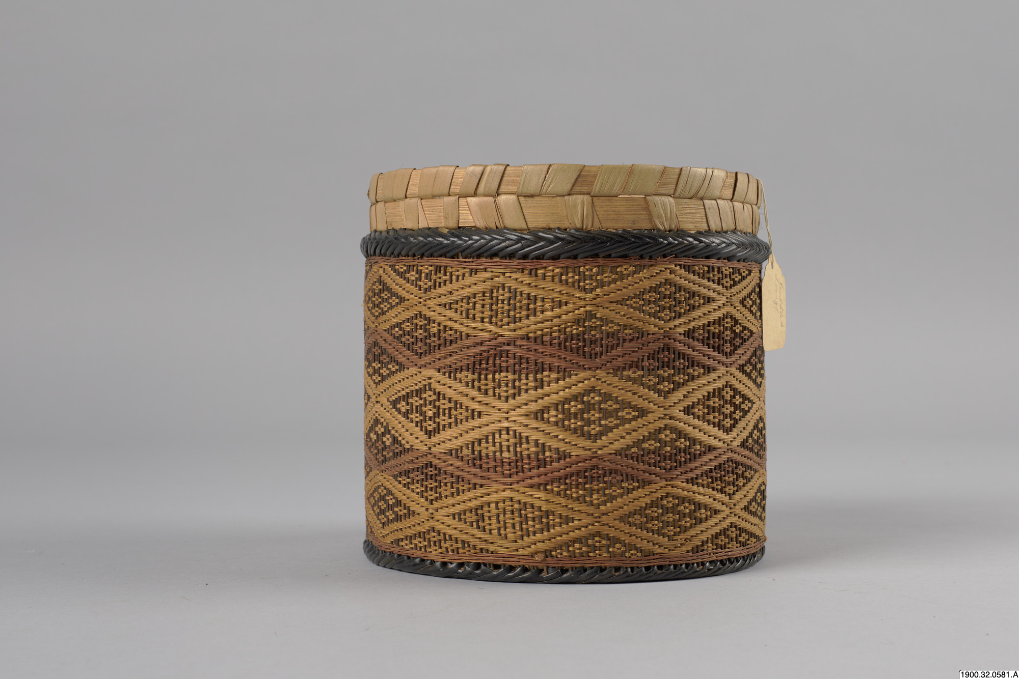 • Cylindrisk korg med lock tillverkat i växtmaterial. Utsidan dekorerad med ett rombiskt mönster. Korgens botten består av en träplatta.