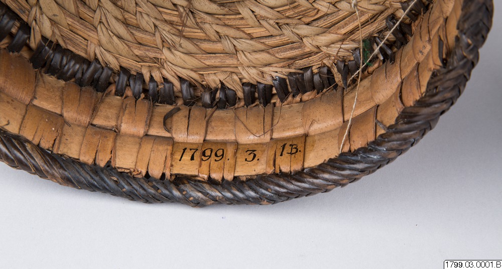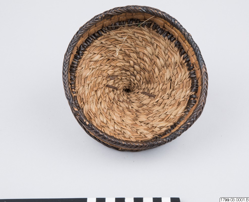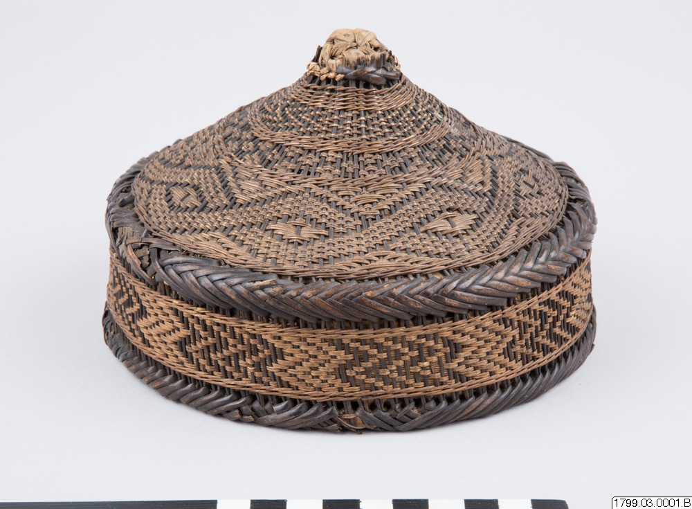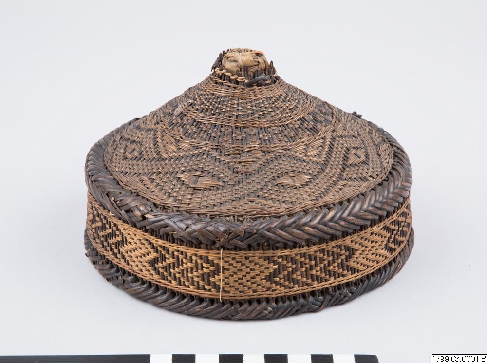 Lock till korg. Av breda cirkelremsor av trä eller bambu, placerade ovanpå varandra och sammanhållna av breda, vertikala band av ett njukare material. Botten och topp spiralflätade av ett annat, hårt, vide-liknande material. Yttersidorna täckta av ett fint, mönstrat nätverk i svart och ljusbrunt.