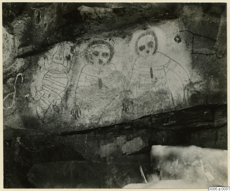 Rock paintings. At the cave Wananami (also name of the large wanjina pictured here). The young wanjina being, Wananami, came here after being refused Joku (termite eggs – a delicacy restricted for the elderly) – KA.