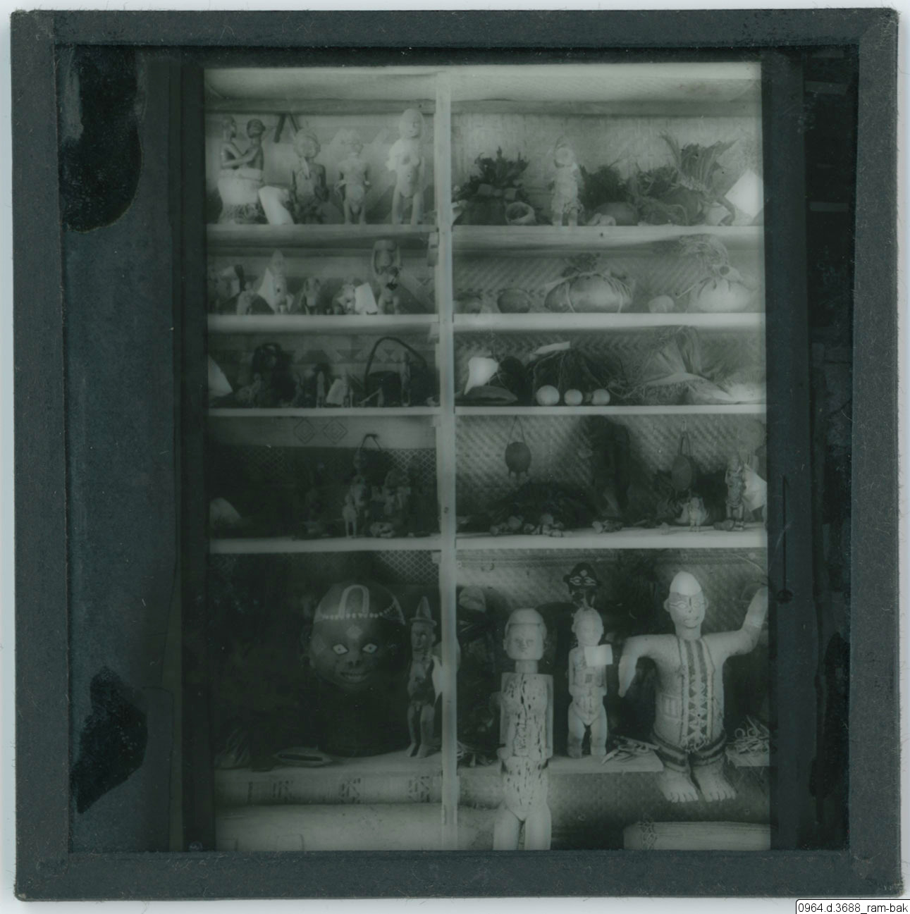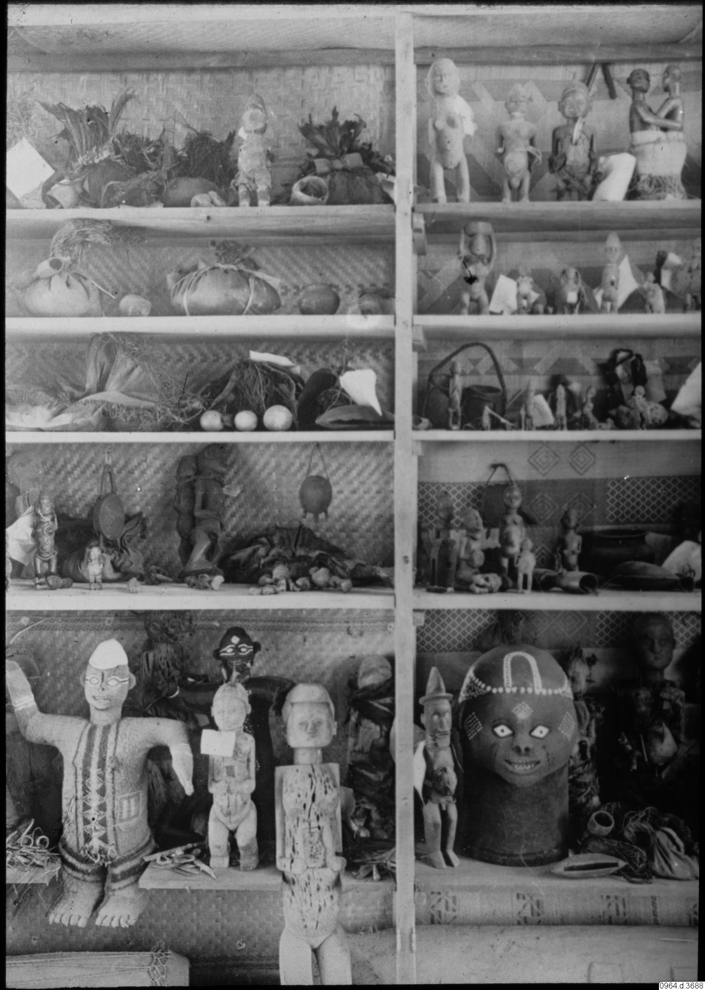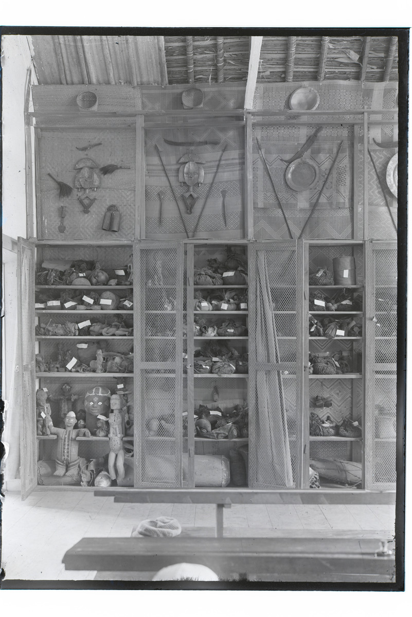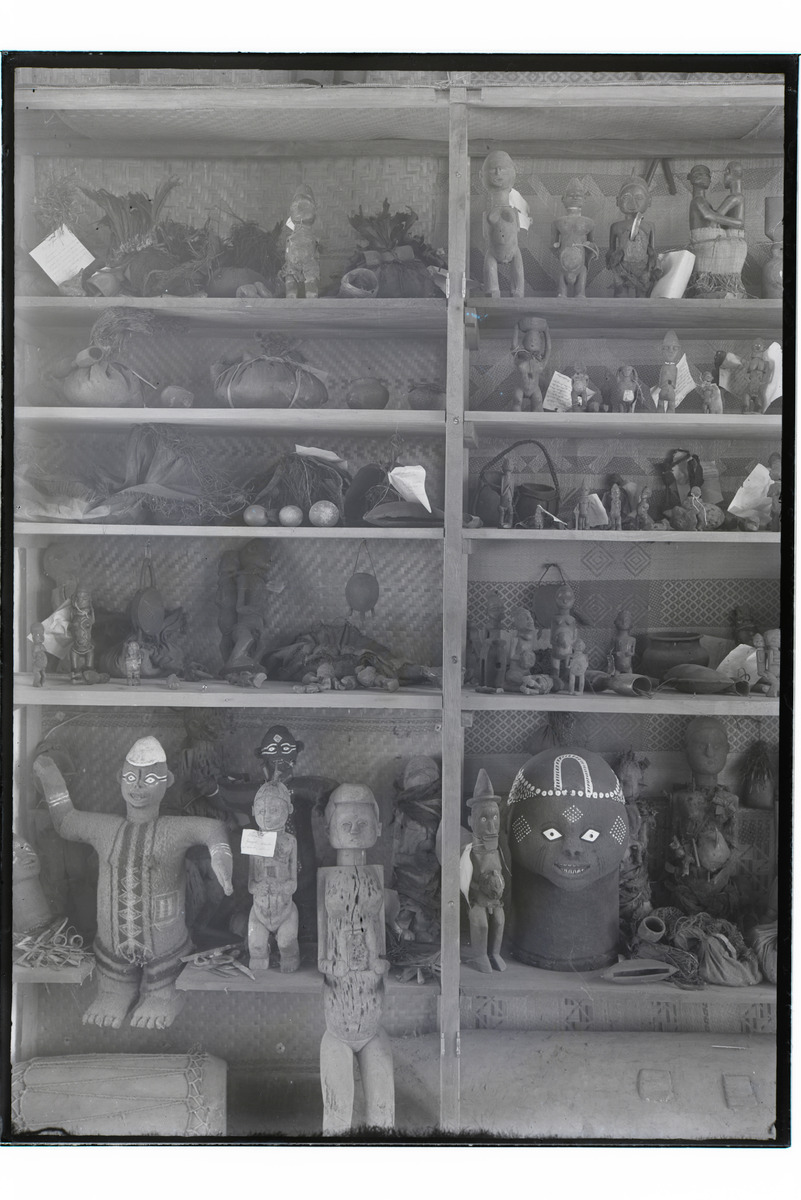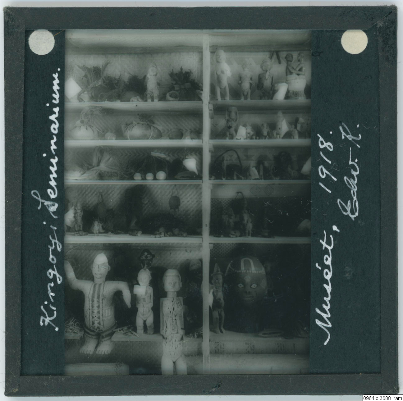 Musée du bas-Congo, à Kingoyi. Exposition de la collection d´objets considérés comme documents primaires, source inépuisable d´informations que le musée ethnographique de la station missionnaires de Kingoyi avait charge de garder. Le missionnaire Edward Karlman, principal acteur et créateur de ce musée au bas-Congo, à Kingoyi en 1912. Noter les cloches en bois à usage religieux, et les statues, dont le ventre est creusé mais aussi les poupées de l´incontournable Niombo, de morphologie bwende.