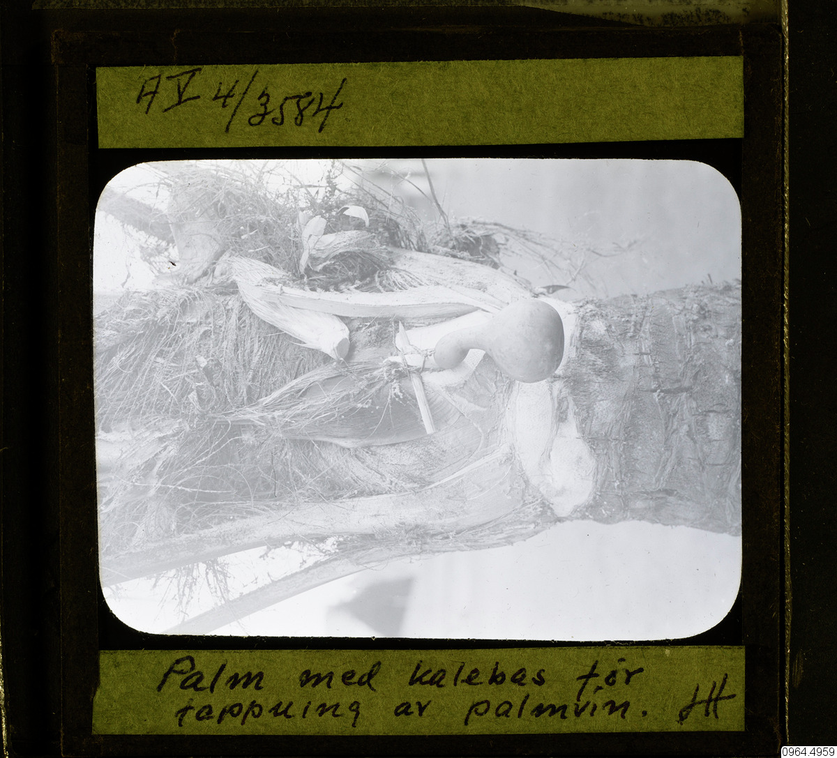 Tappning av palmvin i kronan av oljepalm. Palmklättrare--Muyuluki a maba. Kallebasen är upphängd i trädet för att samla upp palmvin. metoden och tekniken används än idag. Används av en de som tappar upp palmvin." Le Malafoutier" kallas han i folkmun. Men hans roll sträcker sig mycket längre, då palmvin spelar en viktig roll i ett traditionsbundet samhälle.Hansköradar inte bara vin, han vår...