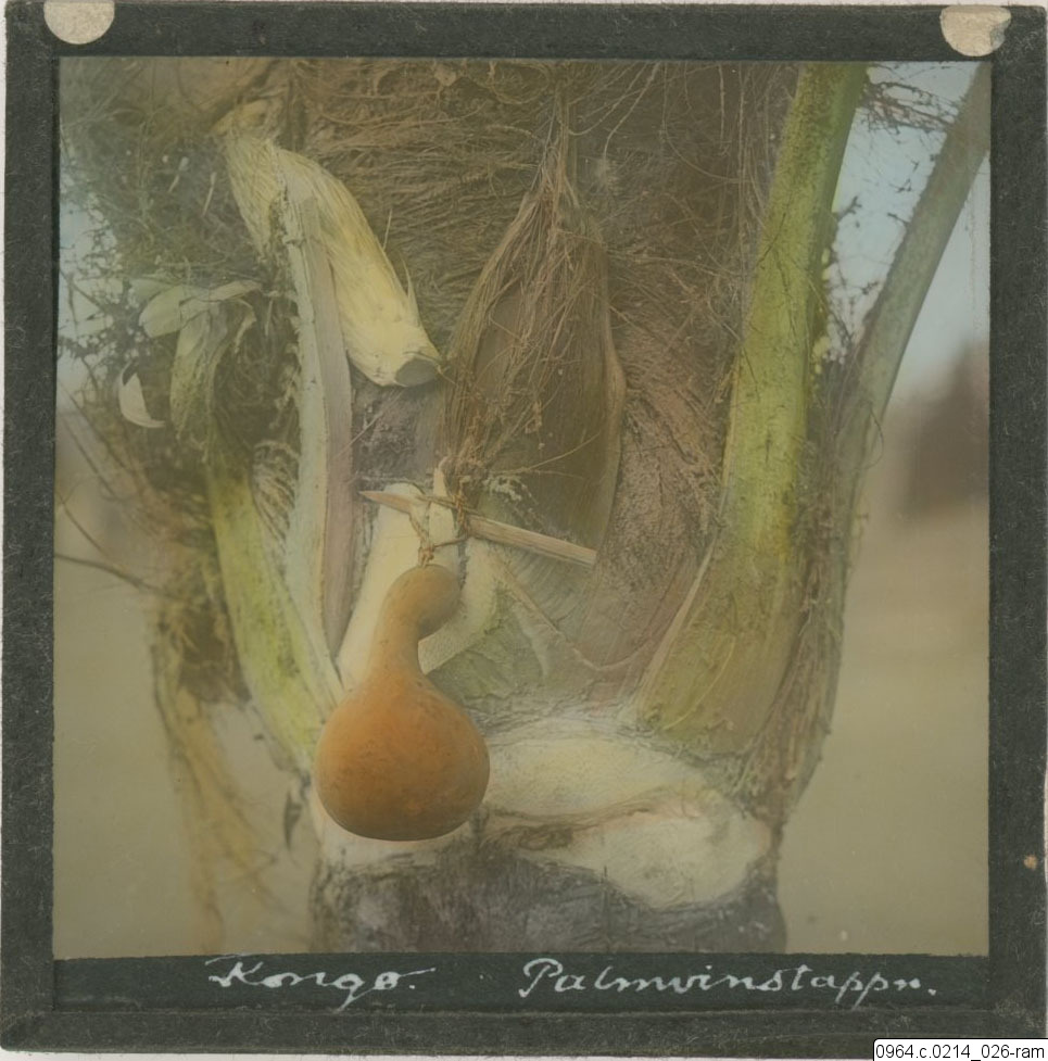 Récolte(soutirage) de vin de palme. Palmklättrare-Grimpeur de palmier-Muyuluki a maba. Calebasse suspendue pour le receuil ou le soutirage du vin de palme. Méthode et technique de récolte est toujours en vigueur jusqu´à nos jours. Elle est appliquée par le Malafoutier ou le récolteur de vin de palme- Le Malafoutier comme vulgairement s´articule son appelation est cette personne qui récolte du vin de palme. Son rôle est autant beaucoups très indispensable dans une société qui reflète les règles de ses traditions quotidiennes où, le vin de palme joue un rôle de premier plan. Il est non seulement le récolteur de vin, mais aussi celui-là qui assure l´entretien des palmiers; il approvisionne la noix de palme aux populations. Beaucoups de repas des Bakongo sont préparés à base de l´huile et jus de la noix de palme vulgairement appelé Mossaka ou muamba ngazi.(Billy, Marius)
