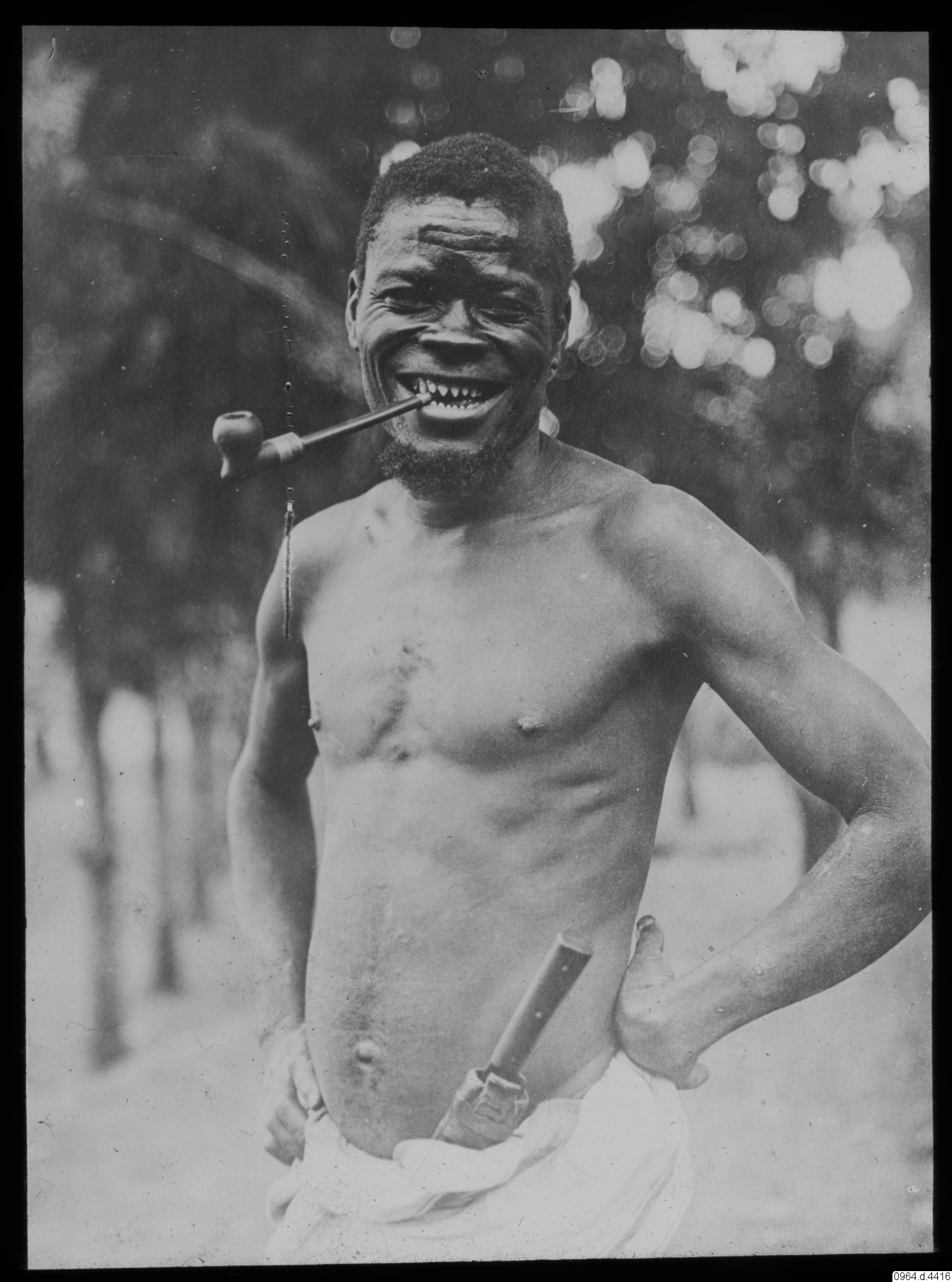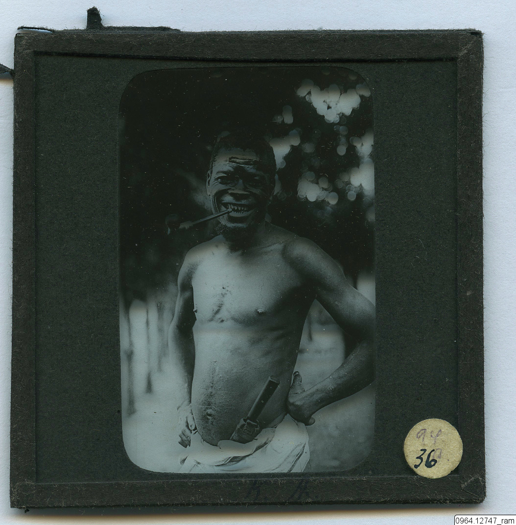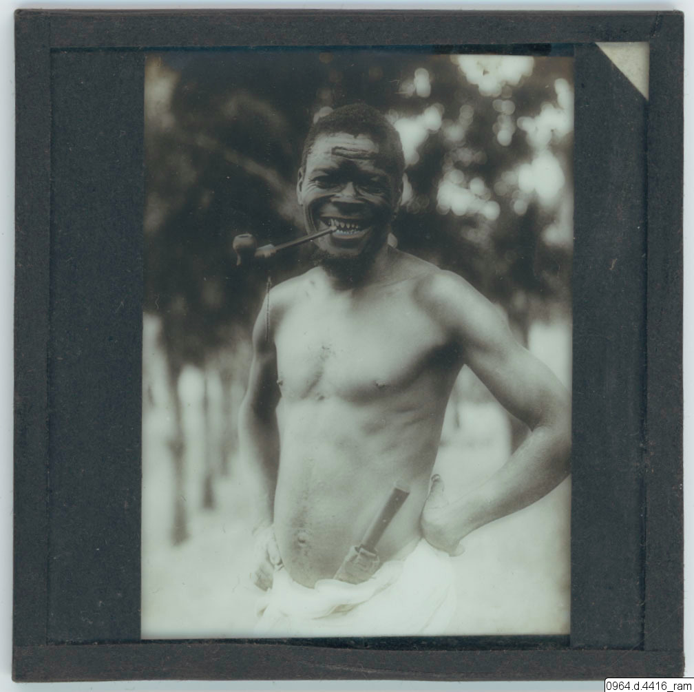45 års man från Ngombe Lutete, bärare i en karavan. Tandfilningen ursprungligen klanmärke. Pipan inhemsk. (Manker, Ernst, 1929, Bland Kristallbergens folk, Stockholm, s. 44)