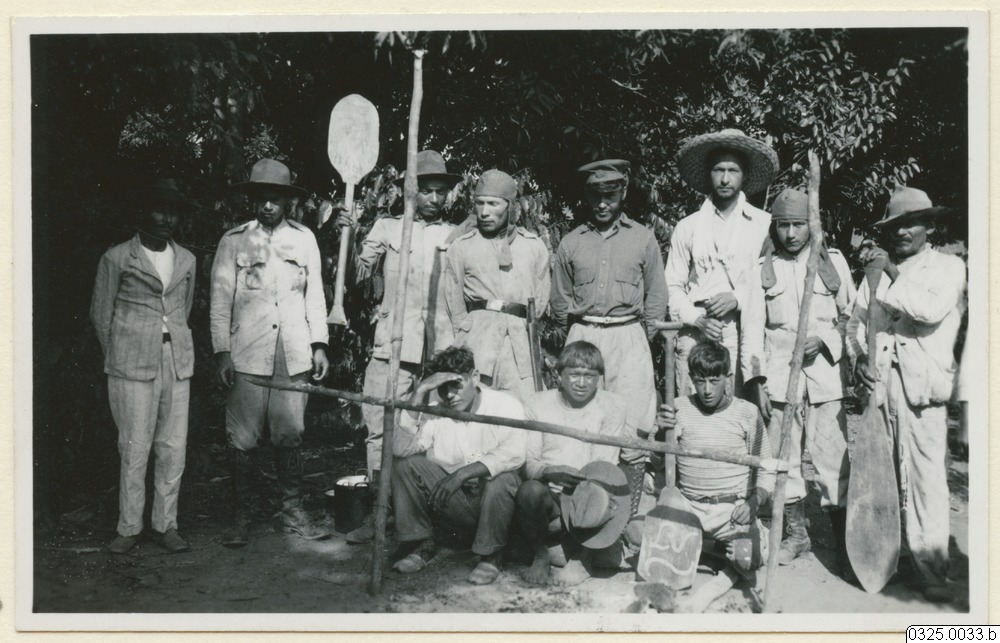 Expeditionens medlemmar (utom förf. och Clemente). (Bolinder, Gustaf, 1936, Med indianer på tropiska floder, s. 57)