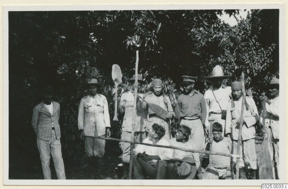 • Expeditionen, gruppbild. Från vänster stående: okänd, okänd, Fernandez (med paddel i handen), okänd, okänd, okänd, okänd, Clemente.