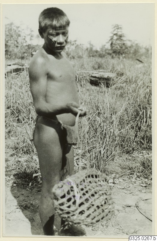 Piapoco-gosse. I korgburen har han en fågel. (Bolinder, Gustaf, 1936, Med indianer på tropiska floder, s. 58)