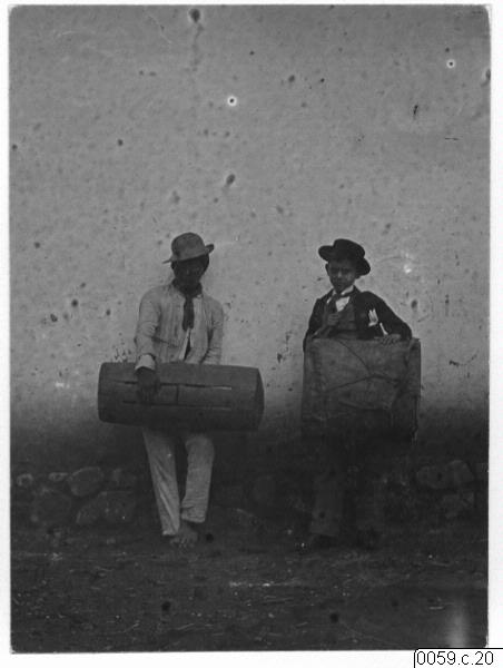 Trummor. Notera iscensättningen Hartman har gjort med en "indiansk" pojke som har en traditionell trumma av trä och "ladino" pojken med en vanlig trumma, untan att motstå att båda typer användes av inhemska brödraskap i staden.