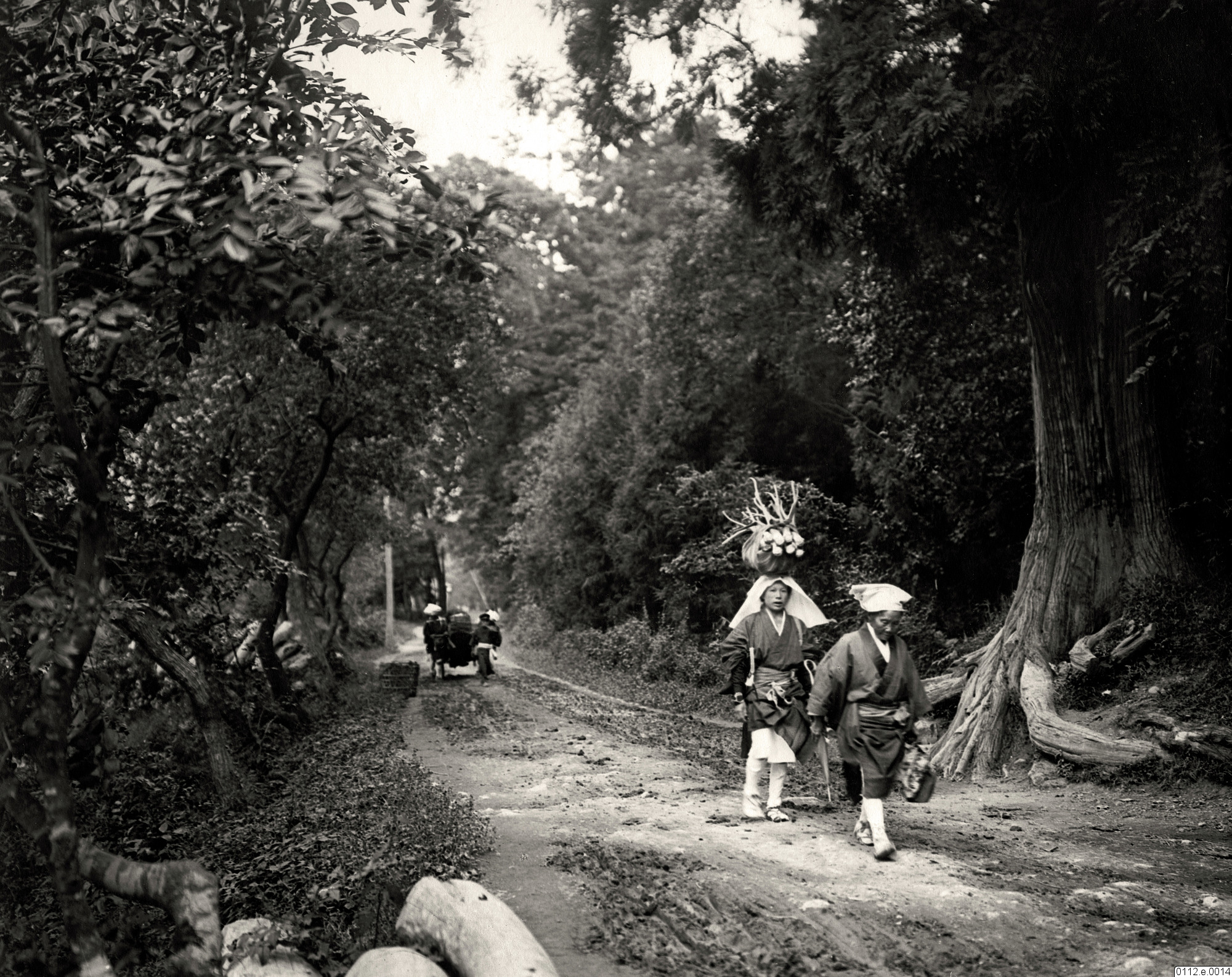 Två vandrande kvinnor. Huvudbördan hos en av kvinnorna utgörs av en knippe stjälkar av vilka man framställer konyaku (en tofuliknande stärkelse som luktar fisk). Åtsittande långa benkläder bars av bondkvinnor i arbetet. Wagner, Ulla bilddokumentation