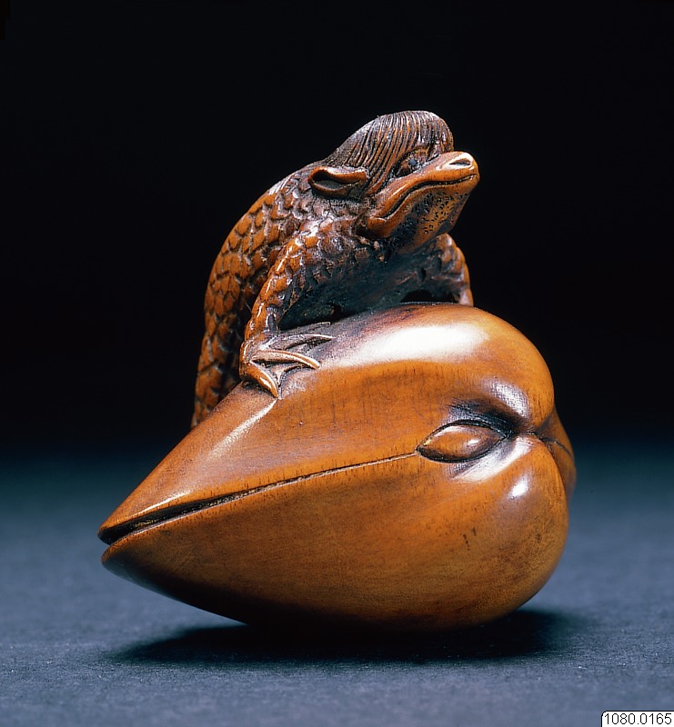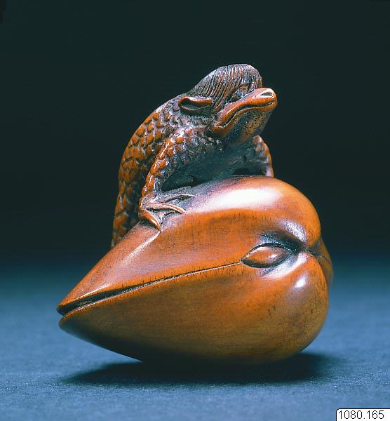 Sid 284 i boken "Med världen i kappsäcken": Föremålsnr 1936.21.2 Bältesknapp, netsuke, i form av av en kappa, som är ett mytologiskt djur, även kallat kawataro, flodbarn, trä.