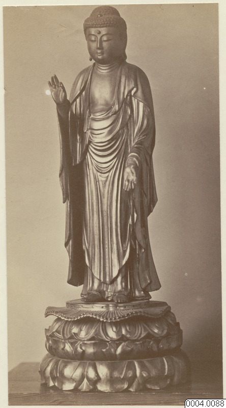 Amida Butsu, den evige Buddha, av trä, förgylld, stående på förgylld, lotusformad fotställning, EU.189.1646, Japan, ur samling 189 (Riksmusei Etnografiska Samling, Stockholm). Föremålsbild tagen i samband med Allmänna etnografiska utställningen.