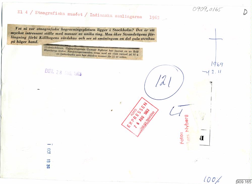 Vet ni var etnografiska begravningsplatsen ligger i Stockholm? Det är ett mycket intressant ställe med massor av unika ting. Man åker Strandvägens förlängning förbi Källhagens värdshus och ser så småningom en del gula stenhus på höger hand (tidningsurklipp, bildens baksida)Stäng