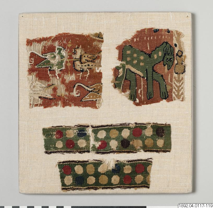 Dokumentation av föremål, tre textilier monterade på samma yta. Alla tre ställdes ut i Egyptenutställningen på Medelhavsmuseet 2014 och då monterades de isär.