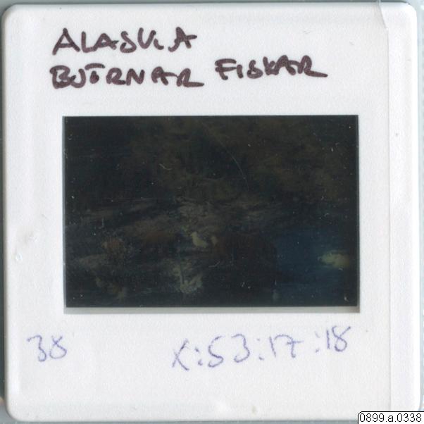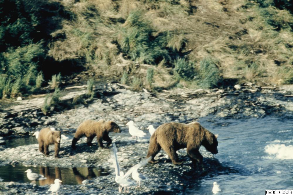 • Björnar som fiskar i en fors bredvid fåglar. Gräskulle(?) i bakgrunden.