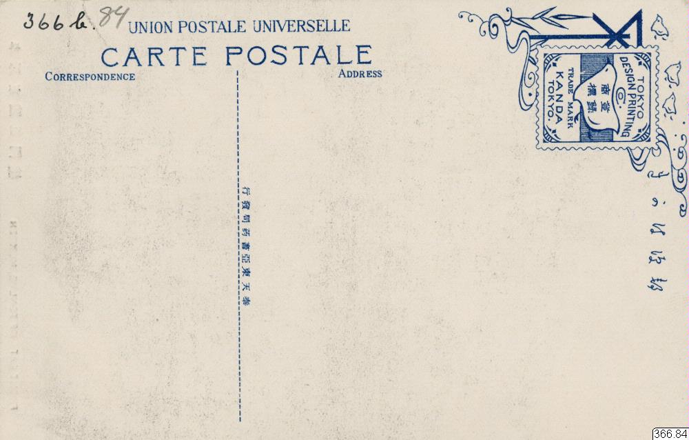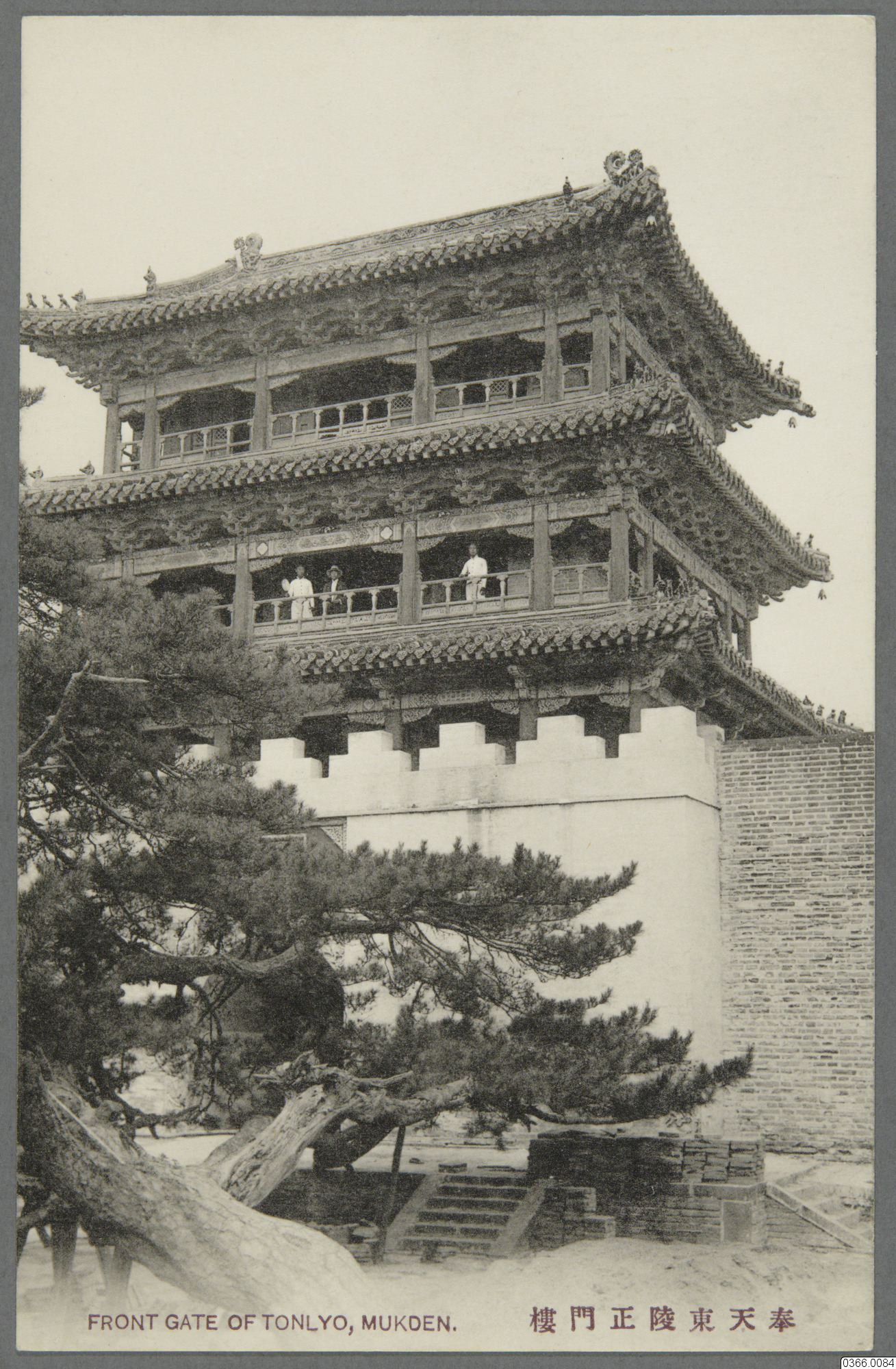 Vykort med motiv av byggnad bakom hög mur, tre människor på ena våningen, träd samt trappa i förgrunden. Byggnad i Shenyang, Kina. Text på framsida: "FRONT GATE OF TONLYO, MUKDEN, Text på annat språk." Text på baksida: "UNION POSTALE UNIVERSELLE, CARTE POSTALE, CORRESPONDENCE, ADDRESS, TOKYO DESIGN PRINTING, TRADE MARK, KANDA, TOKYO, Text på annat språk."