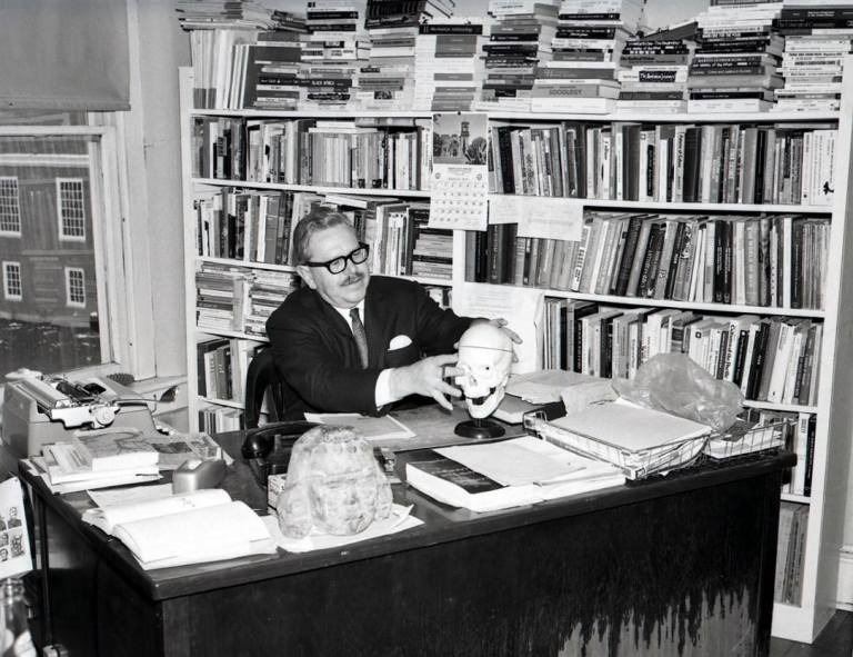 • F. A. Peterson vid skrivbord med (modell av?) kranium. Fotograf: Howard Hiner.