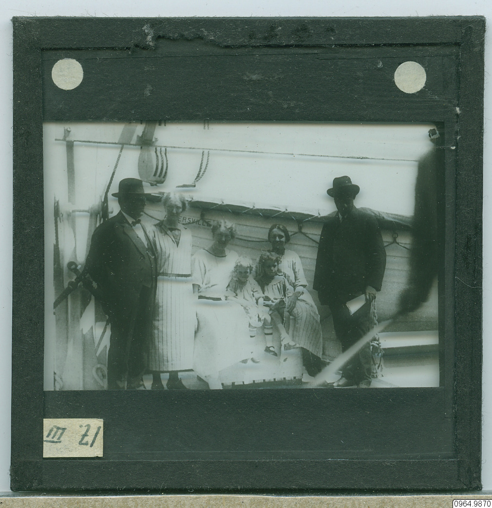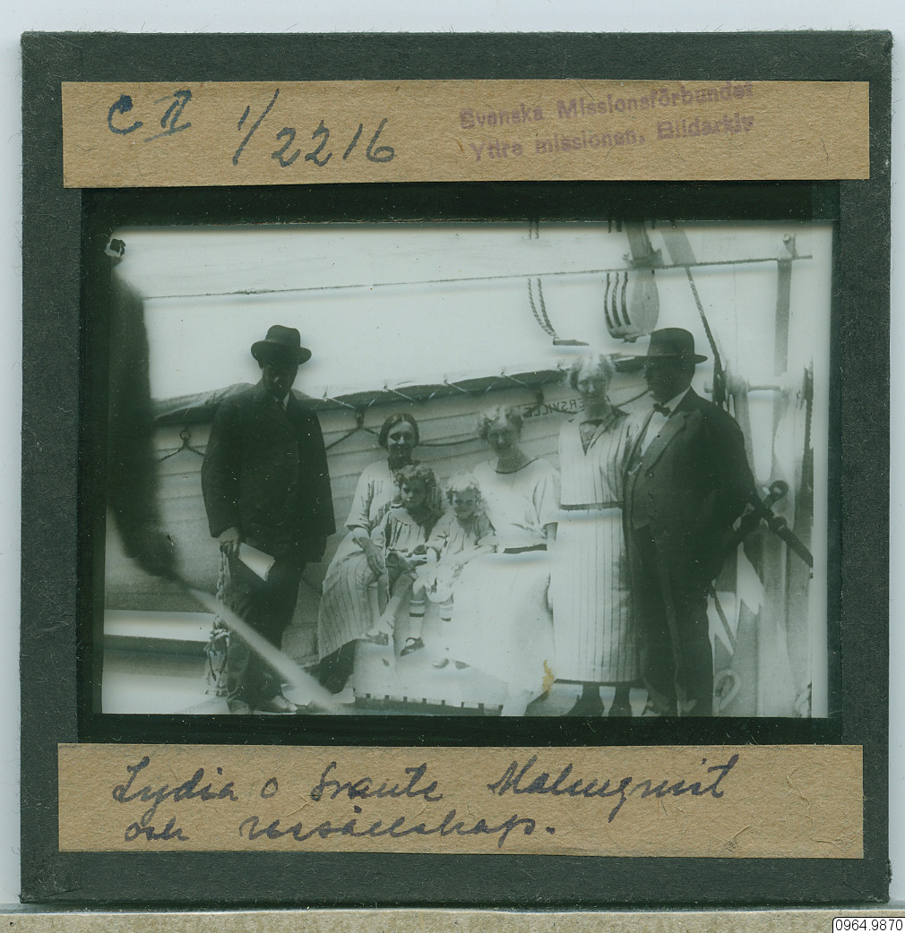 • Lydia och Svante Malmquist med resesällskap. Sannolikt på däck på stort skepp/fartyg med livbåt i bakgrunden.