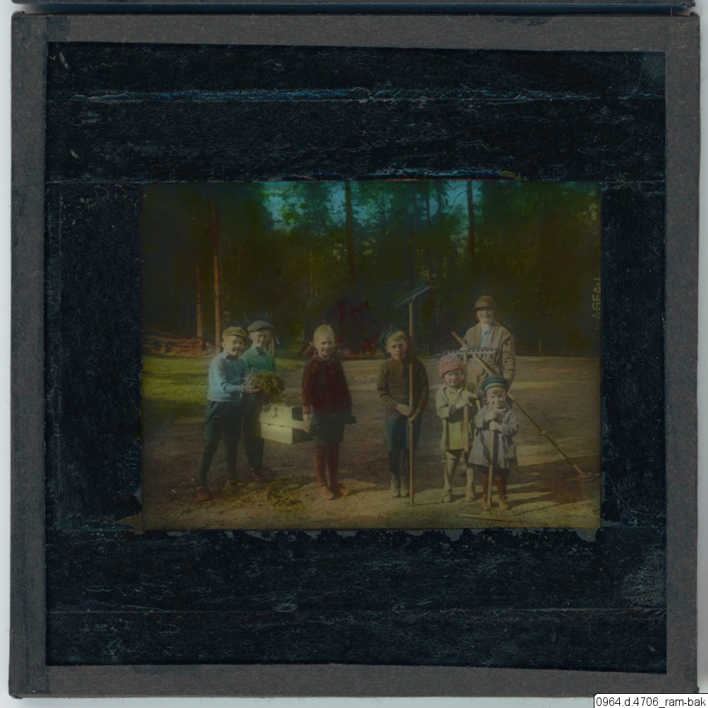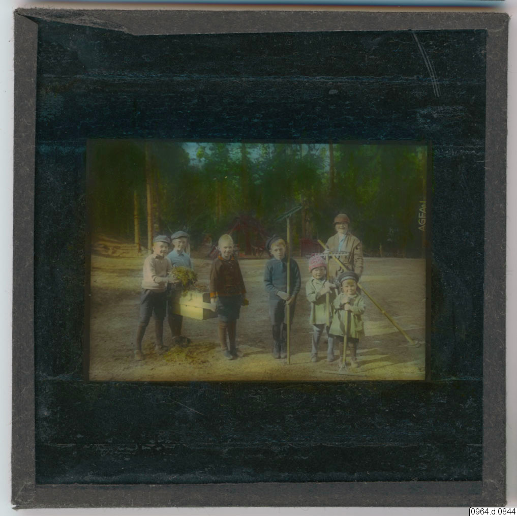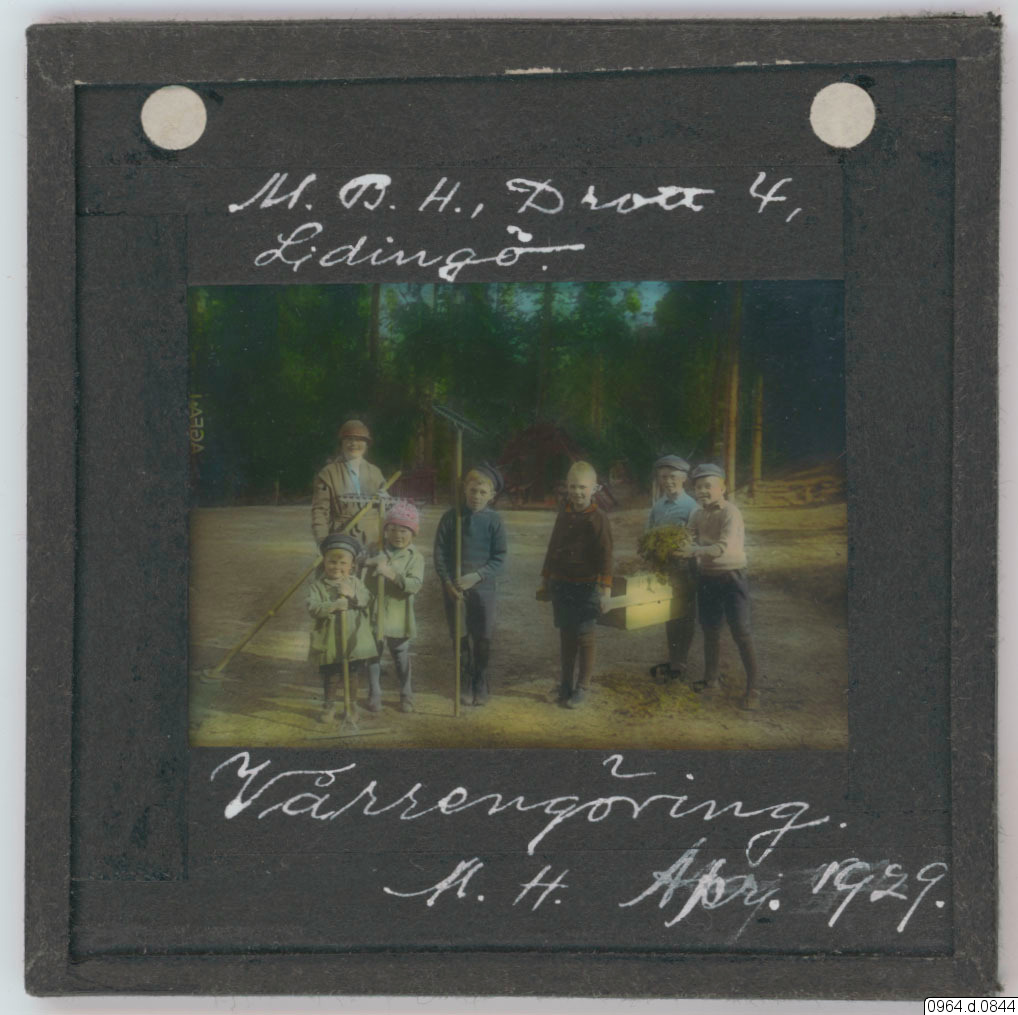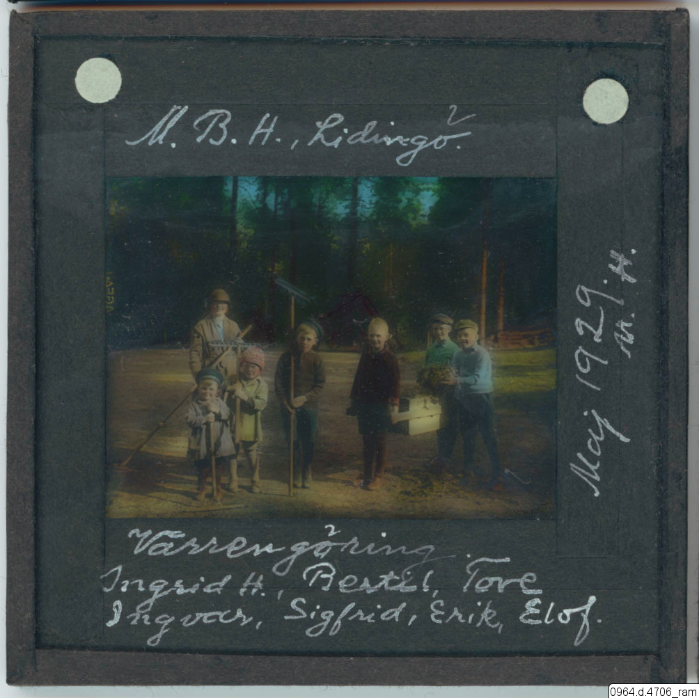 M. B. H. Drott 4. Lidingö. Vårrengöring april 1929. , Lidingö. Maj 1929. Vårrengöring. Ingrid H. Bertil, Tore, Ingvar, Sigfrid, Erik, Elof
