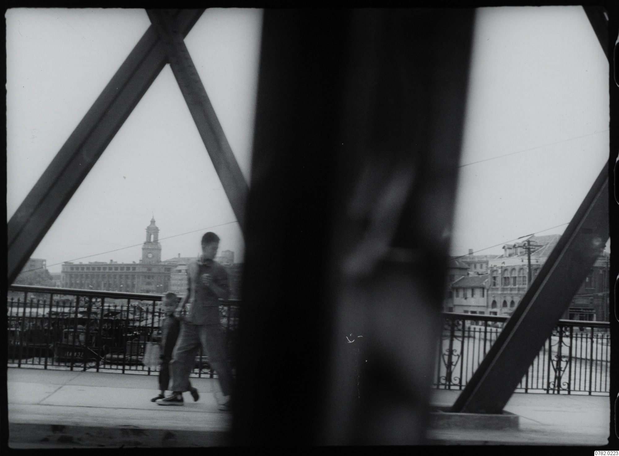 • Man och barn på bro, stad i bakgrunden
