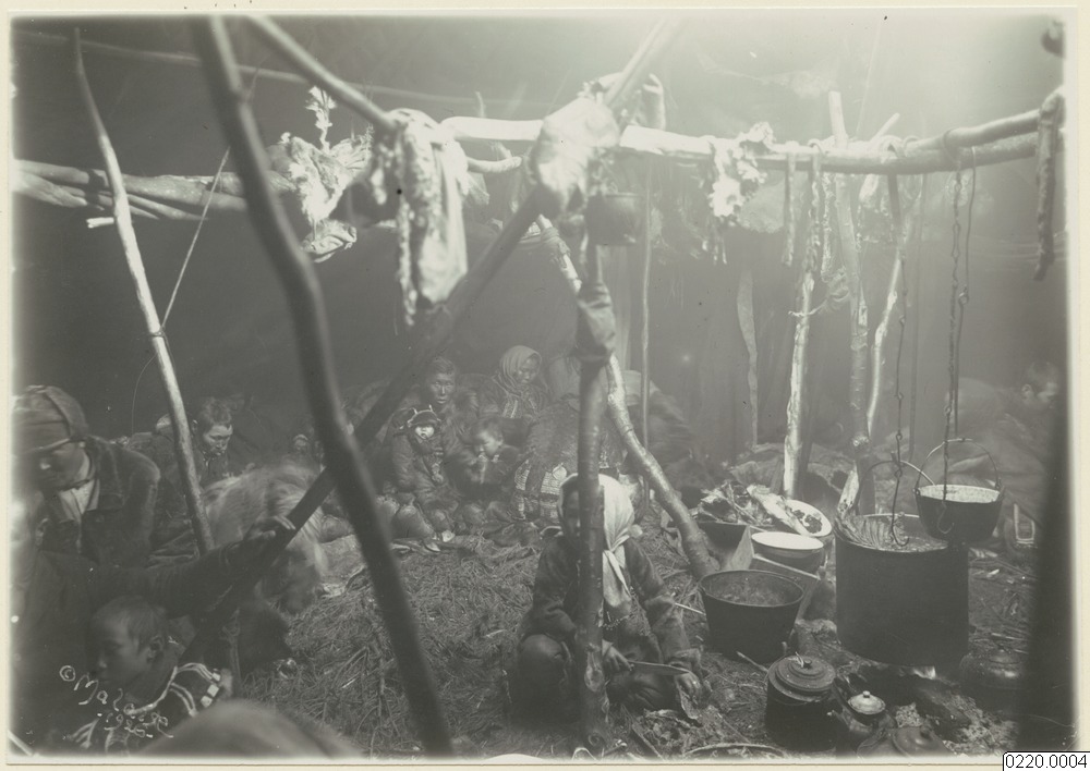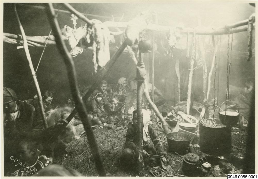 Lamuter; interiör av en jurta, med kärl för bland annat matlagning. Bjelaja Sopka. Ant. av Malaise: Det inre av en lamutjurta. I tältställningarna hänga kött och fett till tork.