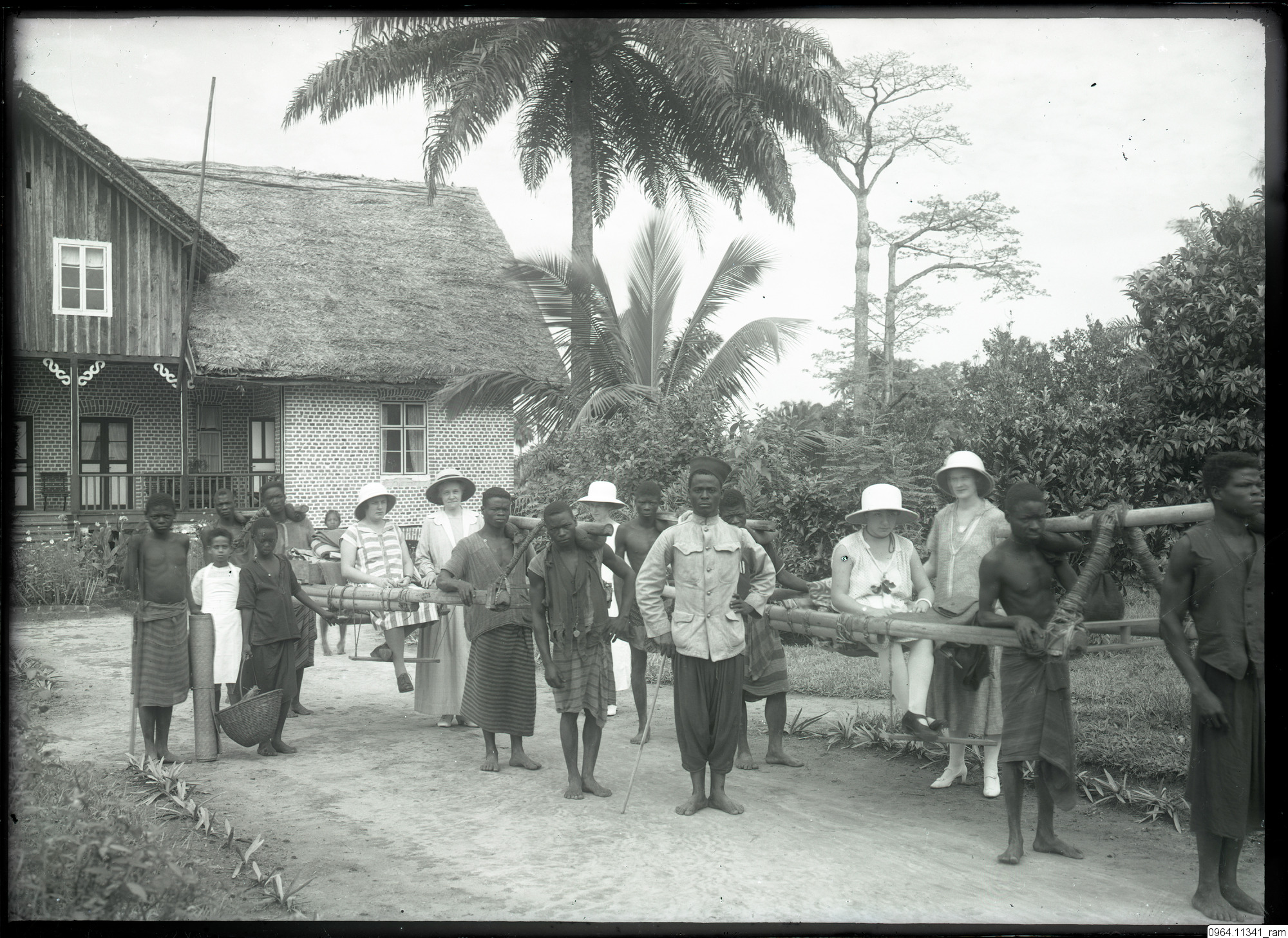 palmer, träd, hus, bärstol, gruppbild, fotografi, photograph