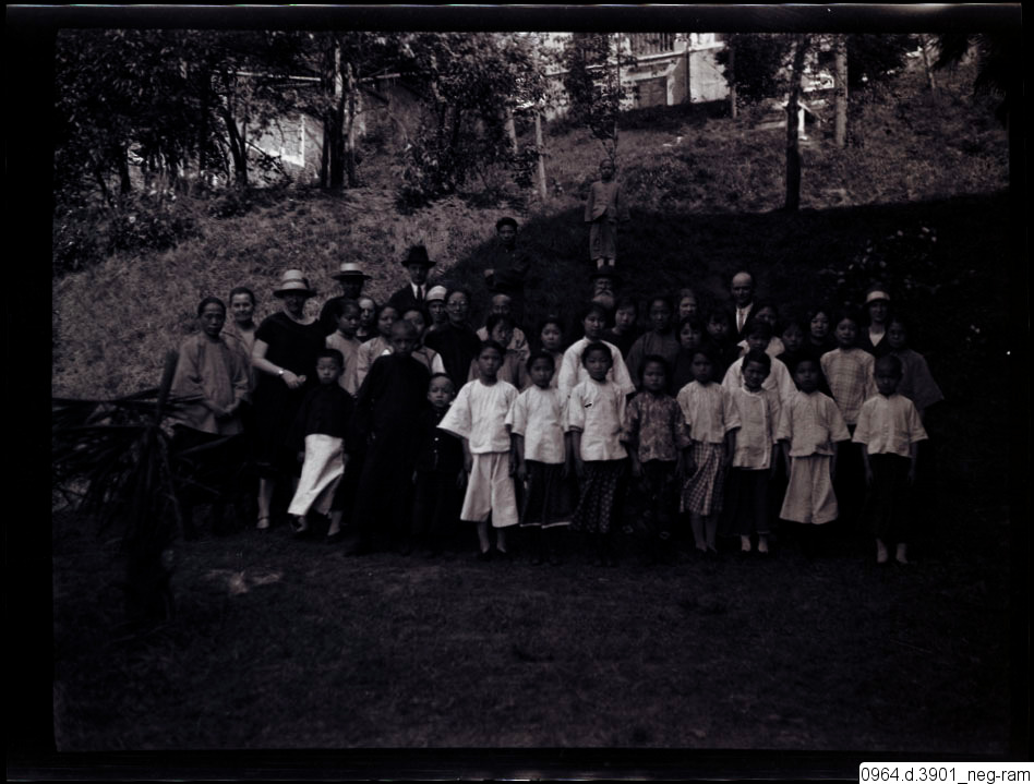 gruppbild, missionärer, barnhem, barn, byggnad, hattar, fotografi, photograph