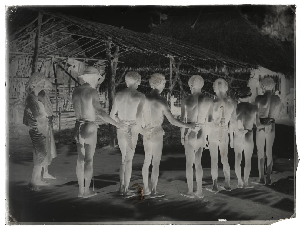 • En grupp med män bakifrån, flera av dem med kniv i slida bakom ryggen. En är rakad i nacken, sannolikt är det "Pula", som porträtteras på tre andra bilder.
