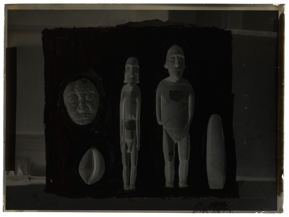 Five Rapanui objects documented in frontal view. The photograph 7-401 and 7-393 were certainly taken at the National Museum of Natural History, Santiago, for they features the known objects from their collection, including the flat female figurine and a realistically-carved cowrie pendant made of wood, (that is what the strange-looking object under the stone head is). The moai kavakava figurine (no 3 from left) was there from about 1870, and, to my understanding, Vanadis expedition made the only high-quality documentation of it. This figurine was published as a drawing in 1873, then it appeared in one unpublished photograph of a modest quality (to use diplomatic wording) taken in about 1911, and at some moment after that it was forever gone. Other objects from the photograph are still in the museum collection. (email from Paul Horley 2026)