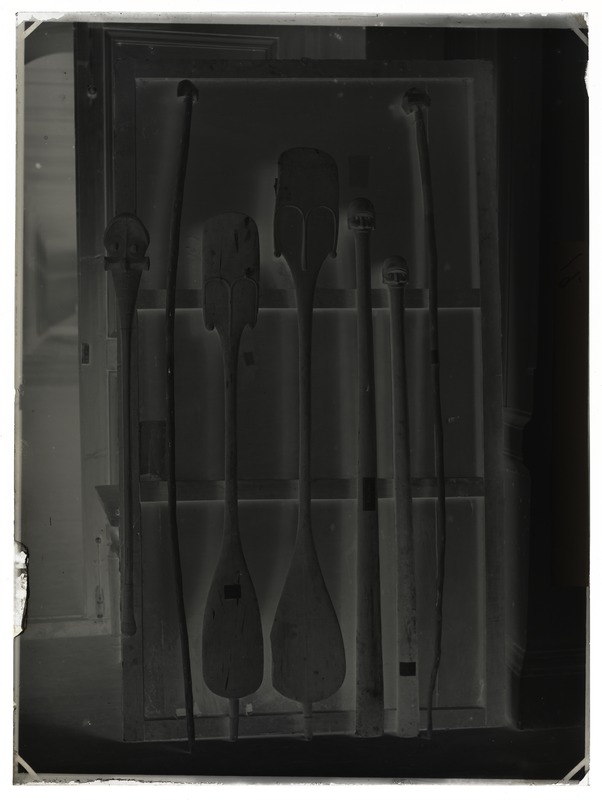 Klubbor, stavar och paddlar (?). Sex föremål från Påskön (Rapa Nui, två paddlar, två hövdingstavar, två spjut) och en klubba från Marquesasöarna (klubban till vänster en så kalla U'u, en krigsklubba).