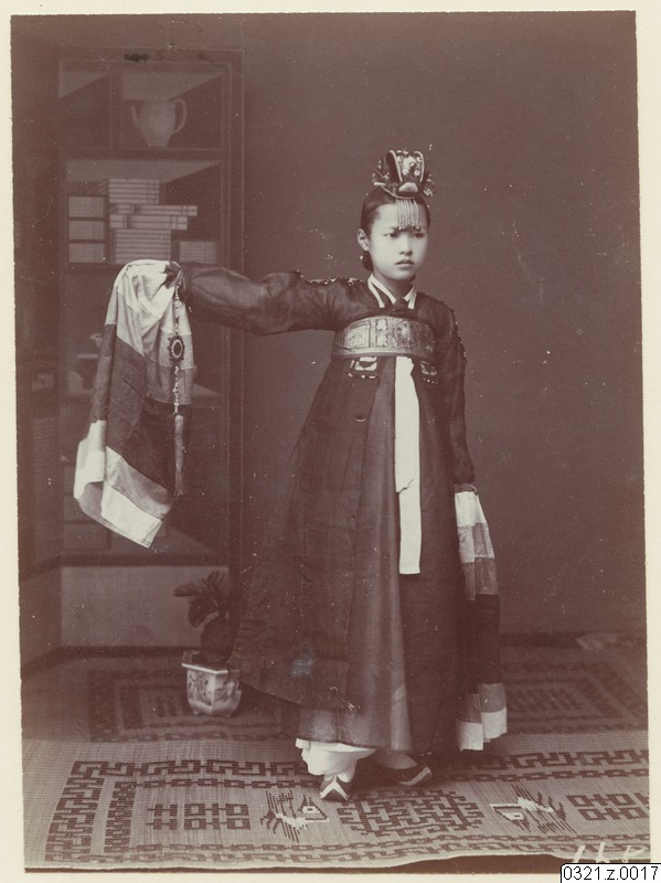 • Korea förr i tiden, 1901-1905 en dansande kvinna. Samma bild finns i Yonsei-universitetets brittiska Cuvilliers-diasamling.