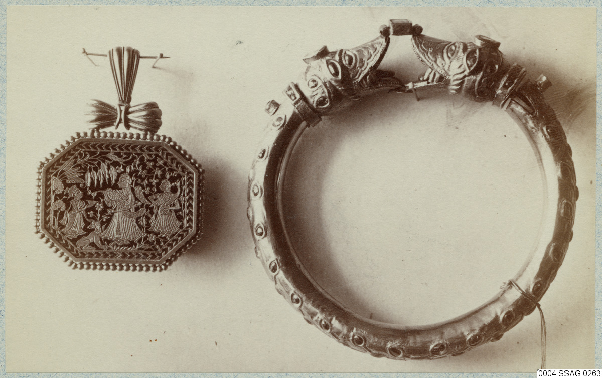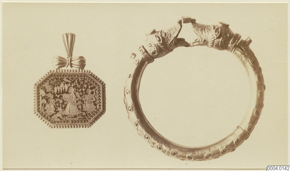 Medaljong av guld, EU.126.39, med i glas graverade, guldbelagda kvinnobilder, Indien, ur samling 126 (Herr James F. Dickson, Göteborg). Armring av guld, EU.80.740, med två djurhuvuden, besatt med röda, gröna och vita stenar, Indien, ur samling 80 (Göteborgs museum). Föremålsbild tagen i samband med Allmänna etnografiska utställningen.