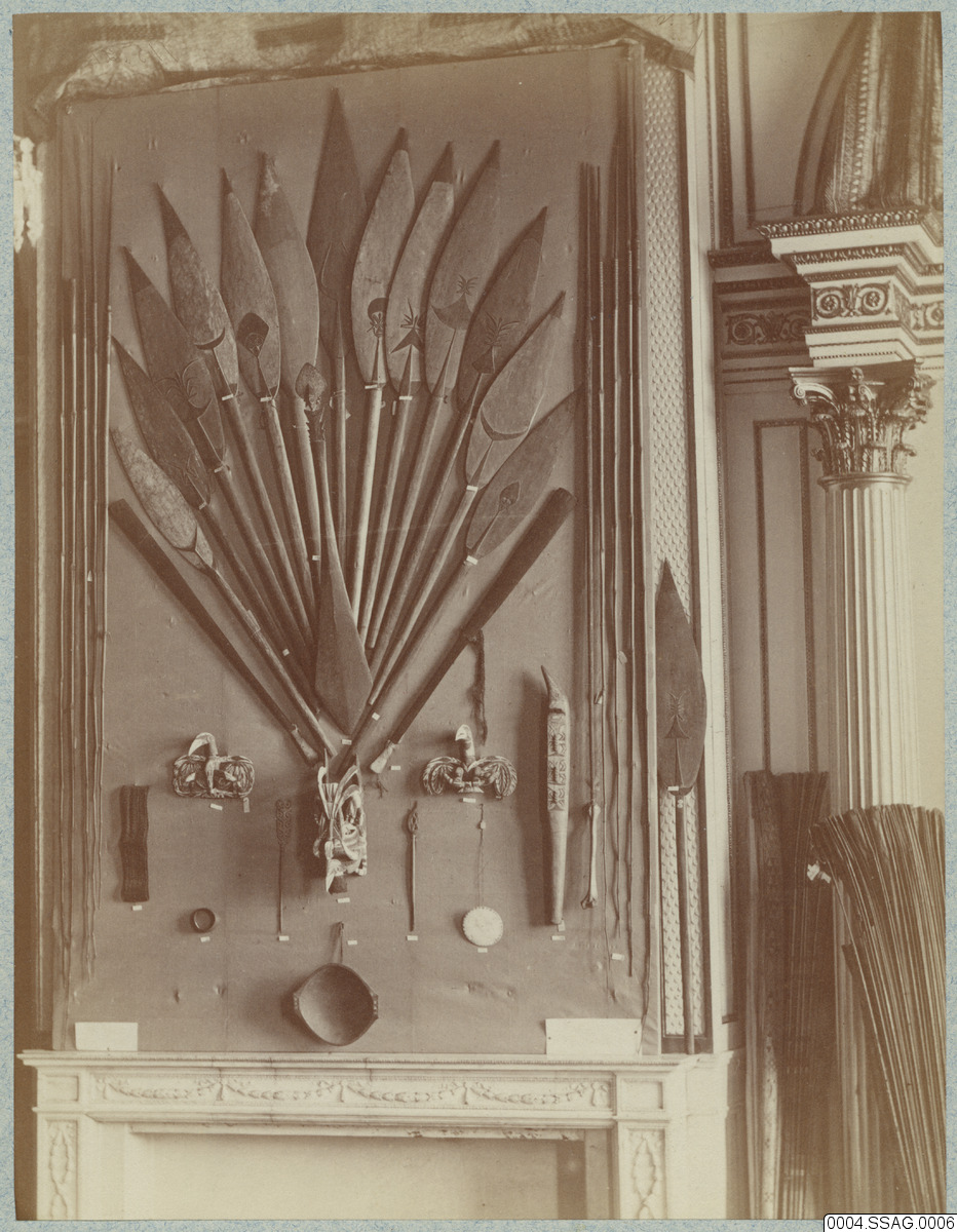 Pagayer (paddlar, "hose"), klubbor mm. De paddlar som sitter i en solfjäder brukar tillskrivas Bougainville ("Buka"), Salomonöarna. De antropomorfa (människolika) figurerna på dessa paddlar kallas "kokorra". Enligt uppgifter på VKM är dock paddlarna från Nya Irland, Bismarckarkipelagen (Papua Nya Guinea) Melanesien, vilket också är den plats som nämns på katalogkortet för detta foto. På bilden syns bland annat även EU.56.33 (centralt, finns även på bild 0004.0202). En del av föremålen (paddlarna) finns numera (2021) på Världskulturmuseet i Göteborg. Bild tagen i samband med Allmänna etnografiska utställningen.