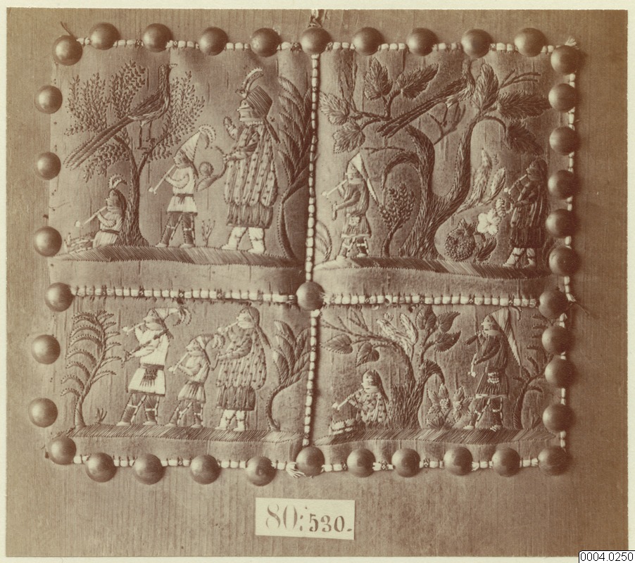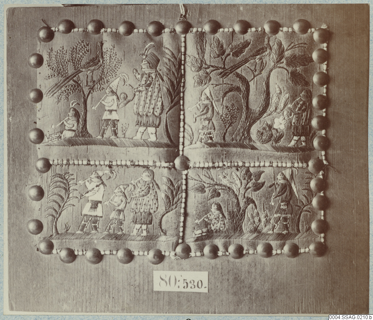 Broderi på näver med färgade taggar av kanadensiska piggsvinet (Erethizon dorsatum), Kanada, EU.80.530, ur samling 80 (Göteborgs museum). Föremålet finns på Världskulturmuseet, 0000.00.0043. Föremålsbild tagen i samband med Allmänna etnografiska utställningen.