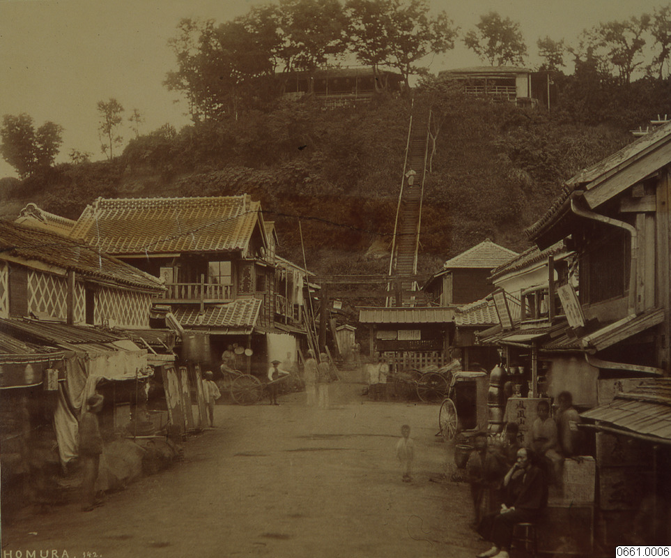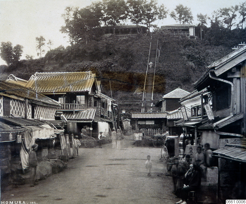 • Bilden visar en äldre gata med traditionella japanska hus byggda i trä och med tegeltak. Längs gatan står flera byggnader tätt placerade, och det finns människor som rör sig eller står vid husen. I bakgrunden reser sig en kulle med träd på toppen.