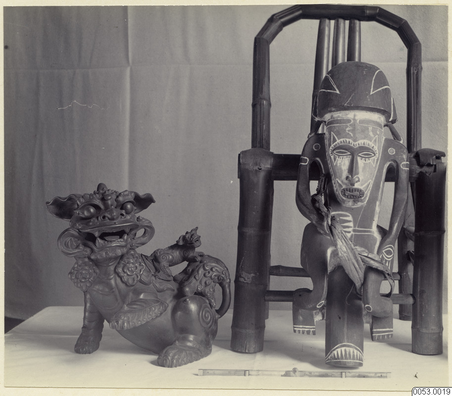 • Museiföremål. T.v. "Fo´s hund", Östasien. T.h. skulptur från Nya Guinea.