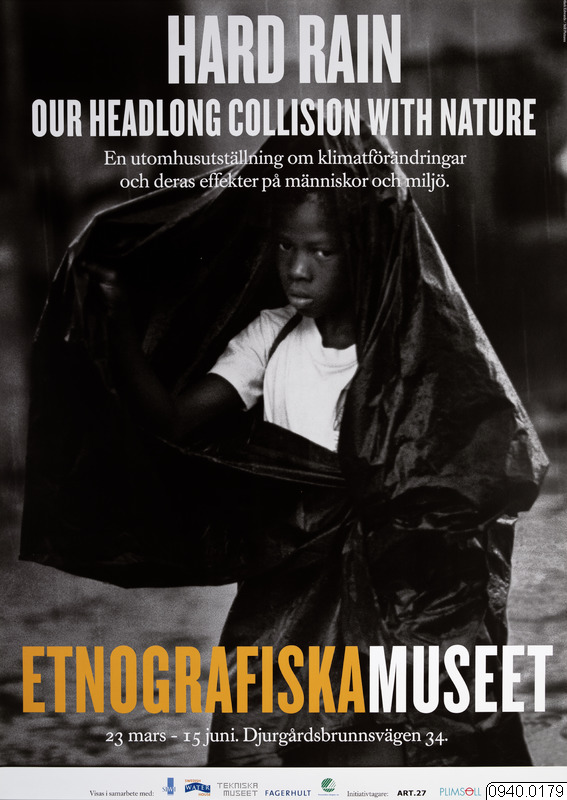 Utställningsaffisch Etnografiska museet för utställningen "Hard rain- our headlong collision with nature". En utomhusutställning om klimatförändringar och deras effekter på människor och miljö.