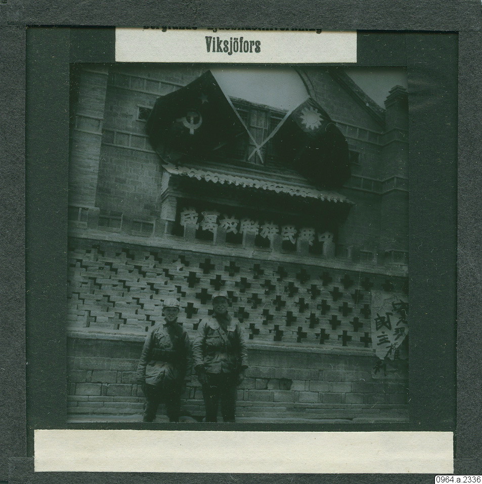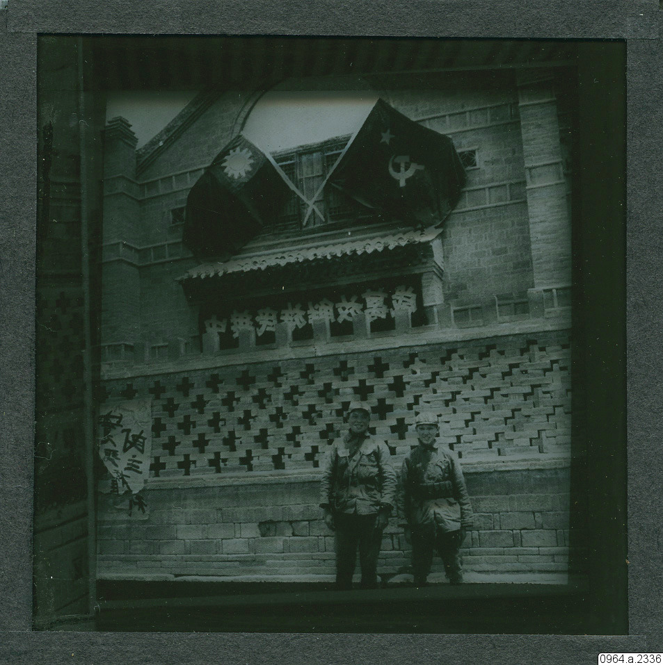 • Flagga, hammaren och skäran (kinesiska kommunistparetiet) och tidigare kinesiska flaggan (röd med blått fält, vit stjärna/sol, idag Taiwan). Jämför med bild 0964.a.2336, tagen på samma plats.