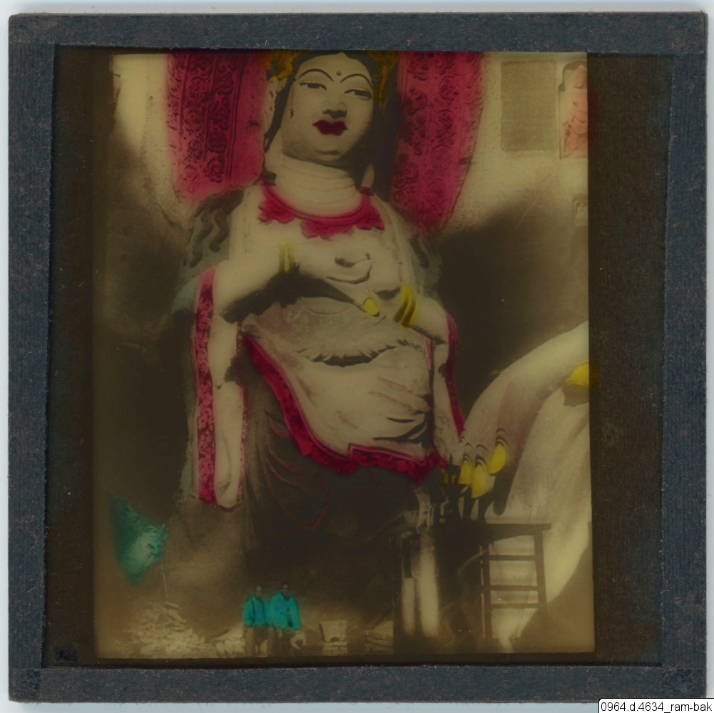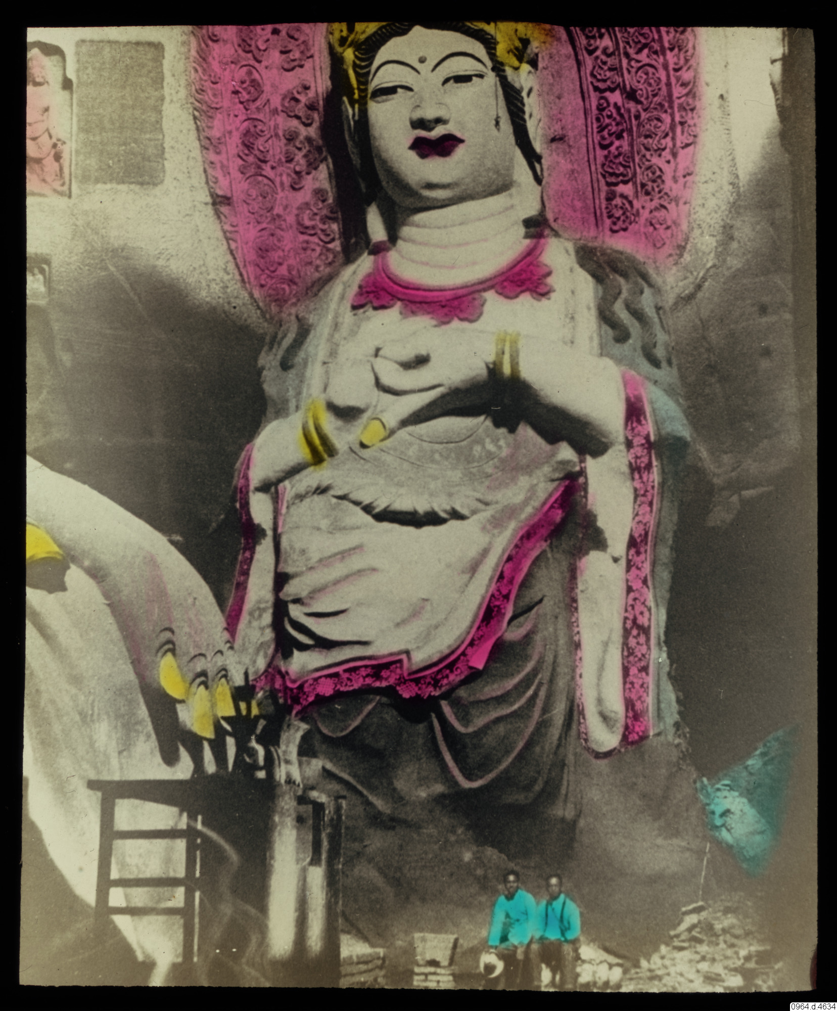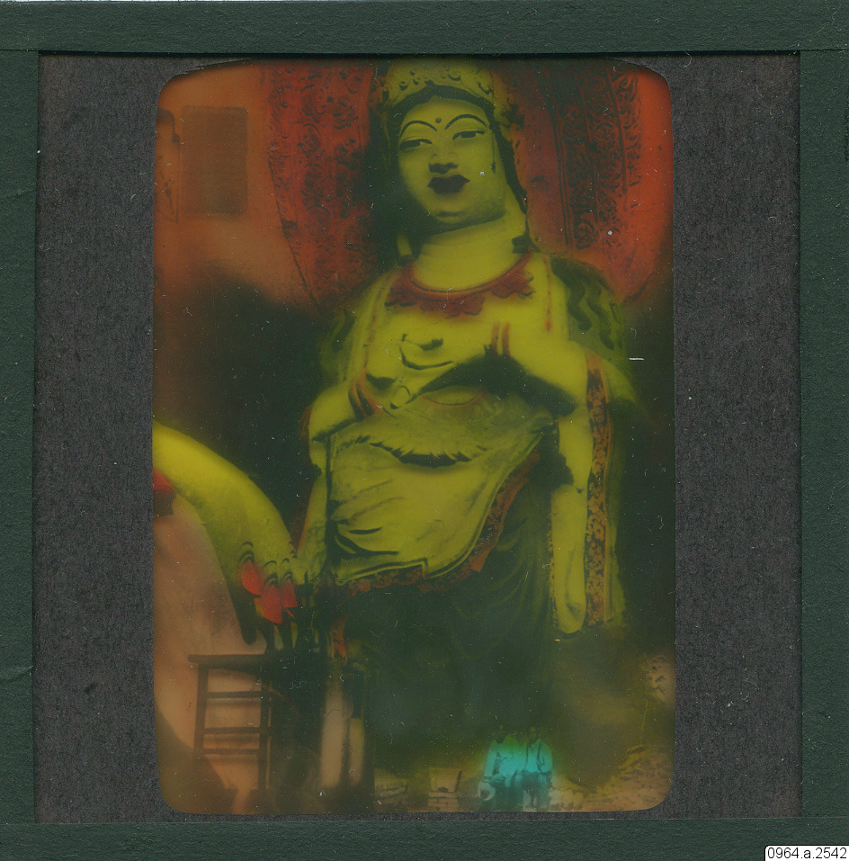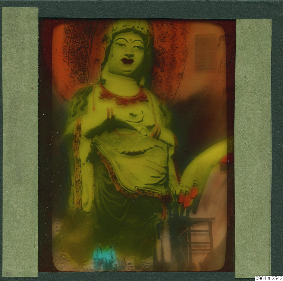 1927. Gigantic deities Kuan Yin Goddess of Mercy, temple Tafotse near Pinchow, Shensi Province, China. Taking-away- fear Buddha. And the Great Buddhas hand at the left, 65-foot statue. Both figures ca...