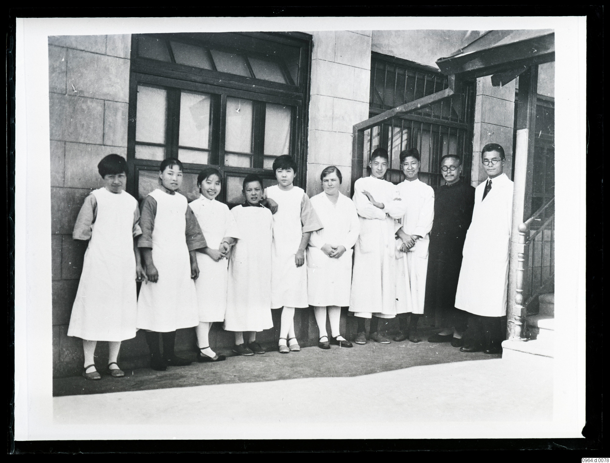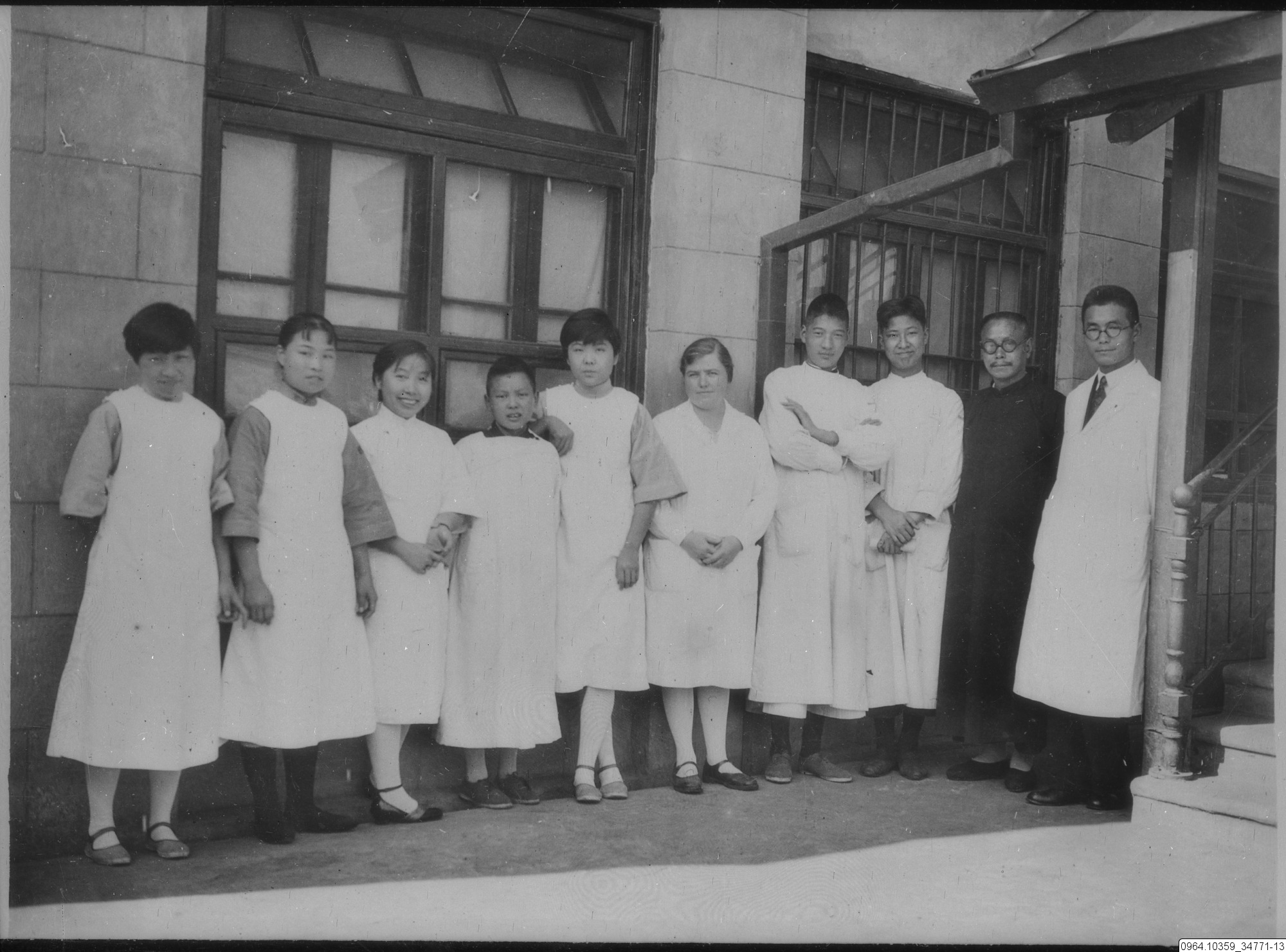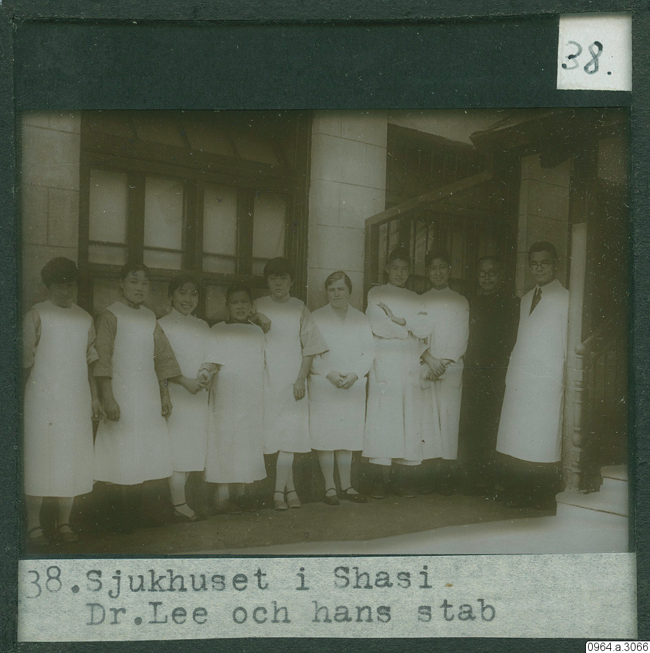 Sjukhuset i Shasi. Dr. Lee och hans stab. Från missionsfälten, sjukhuspersonal framför byggnad, kvinnor, män, präst och läkare.