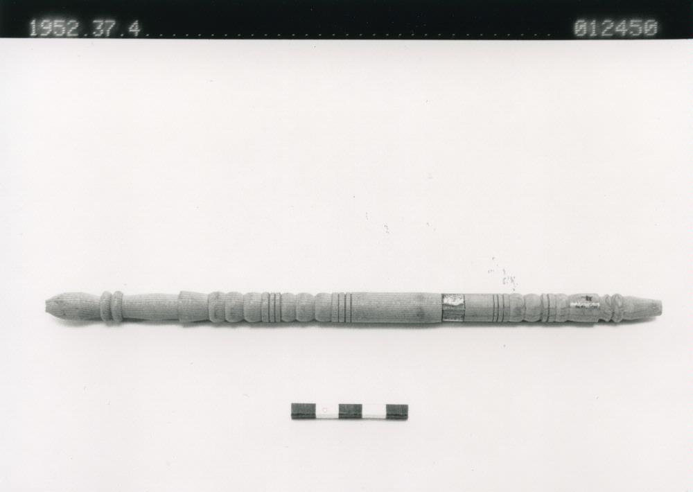 Skaft av svarvat trä till haschischpipa. Tillhörande piphuvud finns bland nummer 7-12 i samlingen (1952.37). Sebsi (marockansk-arabiska = pipa) användes för att röka kif (obehandlad haschisch) blandat med tobak. Denna drog framkallar en känsla av välbefinnande. Tillåtet att odla Kif i Marocko för husbehov och egen konsumtion. Staten odlar för försäljning, främst i norra Marocko. Litteratur: Rausch...