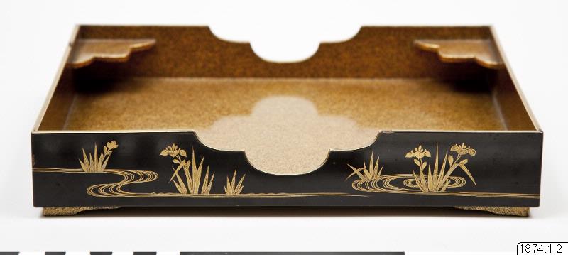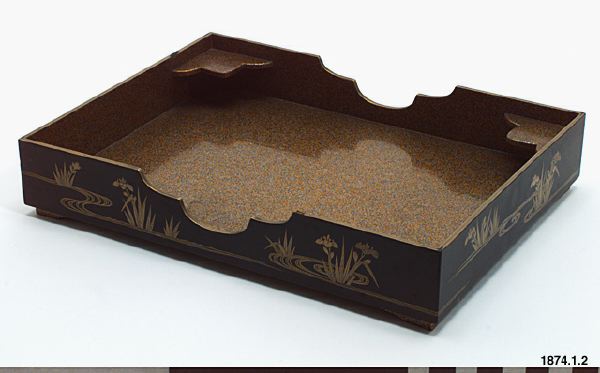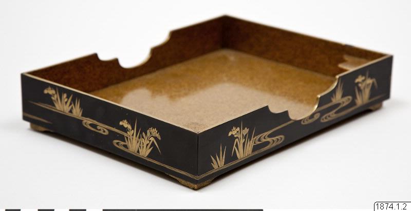 Låda i svart lack samt guldlack av typen blanksvart lack (ro-iro), insidan i s k nashiji-lack (på engelska benämt aventurinlack) med guldkanter. Dekor av iris och rinnande vatten i hiramaki-e-guldlack.