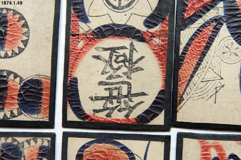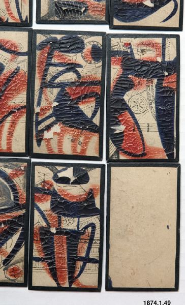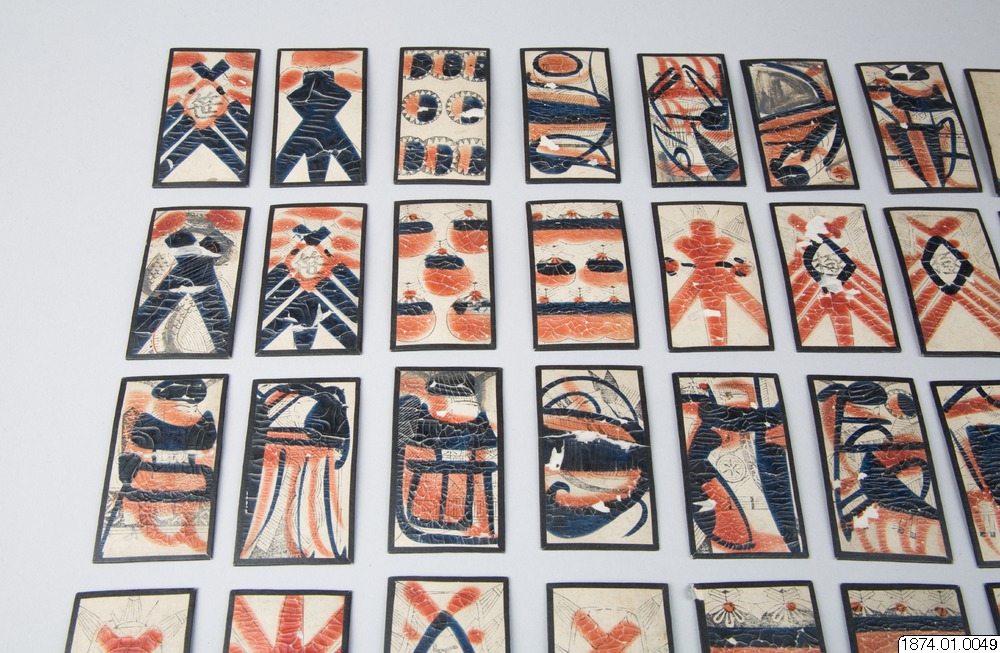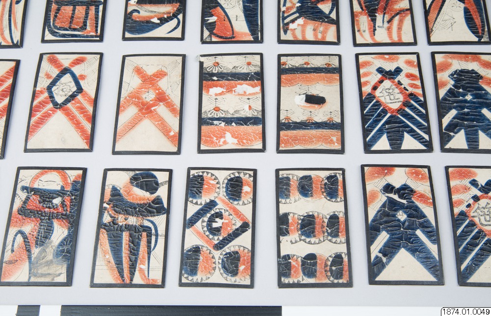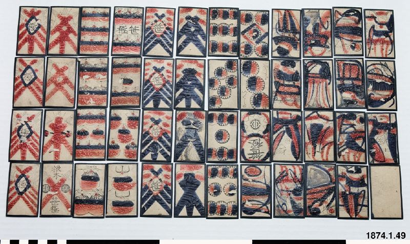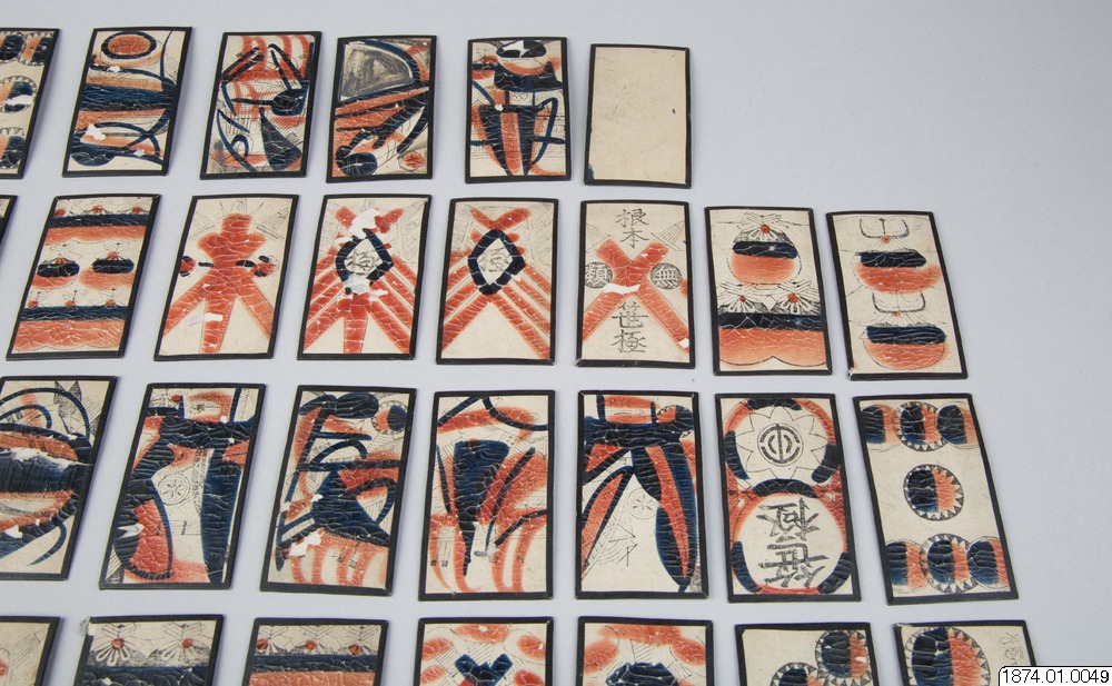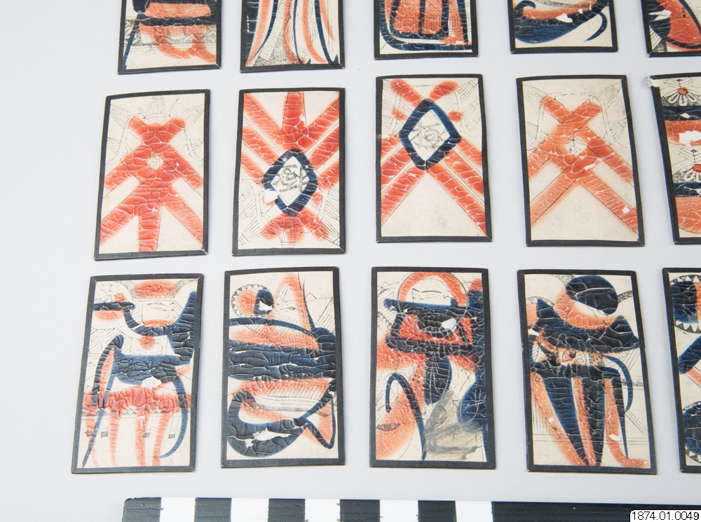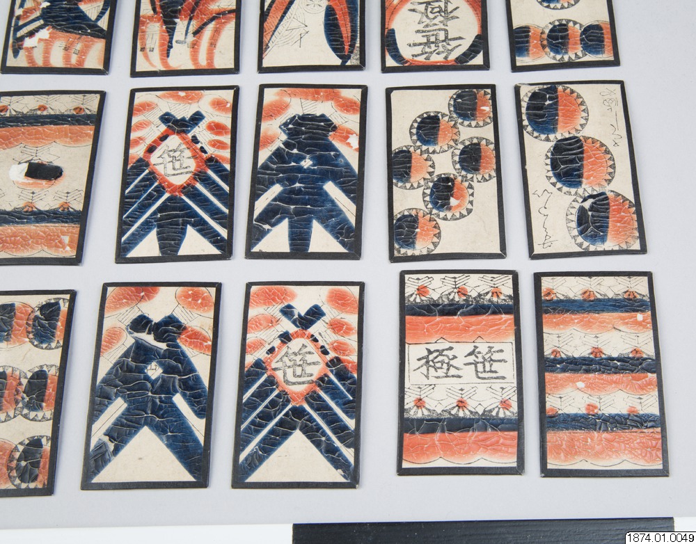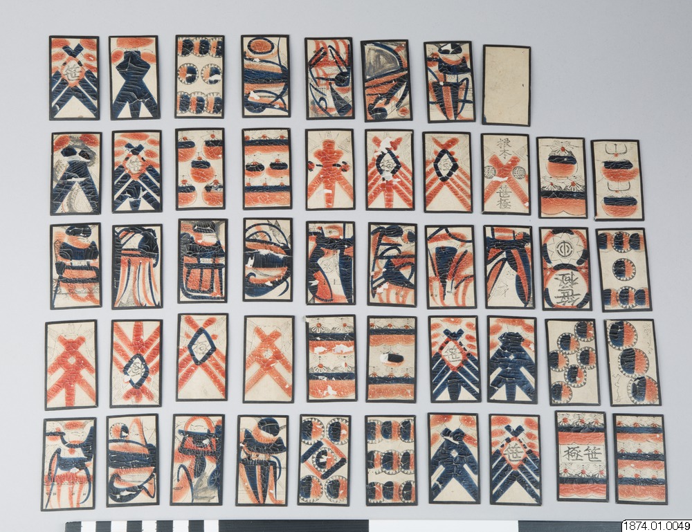 Spelkort. Enligt arkivuppgifter 49 stycken. (Orig nr. 40), men 48 stycken. Längd 6,2 cm. Bredd 3,5 cm. Saml. Carl Peter Thunberg Spelkort av detta slag började tillverkas och användas i Japan efter inspiration från portugisiska spelkort, som kom till Japan i och med portugisernas ankomst under andra hälften av 1500-talet. De kallas "karuta" efter portugisiskans "carta" och förekom i oilka former, till exempel som komatsufuda karuta (uppsättning med 48 st kort) på sent 1500-tal och unsun karuta (75 kort) på sent 1600-tal. Motiven tros vara abstraherade och stiliserade former av spanska, portugisiska och italienska spelkort med spader, ess osv, designade för att int elalltför tyldigt efterlikna dessa. Kortspel av utländskt ursprung var allmänt förbjudna i Japan men spelades till sjöss. /PH Text från Världskulturmuseets hemsida (https://www.varldskulturmuseet.se/utstallningar/varldens-spel/mekuri, 20240614): KORTENS KORSVÄGAR Förlagan till kortleken som reproducerats är en kortlek från vår samling. Den är en av världens äldsta bevarade japanska kortlekar. Den togs till Sverige på 1770-talet av en lärjunge till Carl von Linné som hette Carl Peter Thunberg, som köpte den under en resa. Medan hans skepp låg och väntade på gynnsamma vindar på väg från Nagasaki till Edo kom han närmre den japanska besättningen än vad som var vanligt. Han fick se hur de spelade kort, vilket han inte hade sett några japaner i land göra. Korten som användes av de japanska sjömännen är i sin tur en variant av den latinska kortleken. Den är indelad i de fyra sviterna stavar, svärd, bägare och mynt samt har klädda kort likt sin europeiska förlaga. Portugisiska köpmän och missionärer tog med sig kortspel till Japan på 1500-talet. Därför kallas kort i Japan för karuta efter det portugisiska ordet carta.