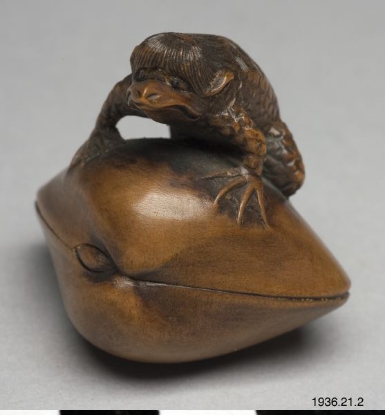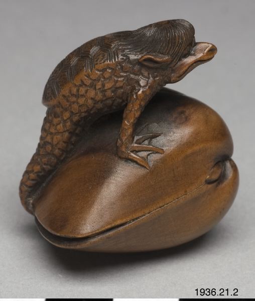 • Netsuke av trä. Det mytologiska djuret "kappa" med sin livselixirbehållare (vattenskål) på hjässan som kliver upp på en mussla. Troligen ny. Inte signerad. (generalkatalogen)