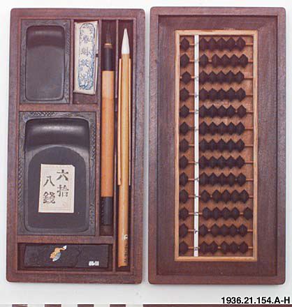 Ask för skrivdon med abacus i locket. (generalkatalogen) Kulram (abakus, på japanska soroban) var ett nödvändigt räkneverktyg för bl a köpmän. Här är kulramen en del av en skrivask med bl a penslar, tuschstång och rivsten för tuschet.