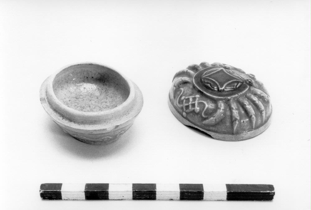Ask av fajans, ornament av krabba. För rökelse under teceremoni. Kyoto, Japan.